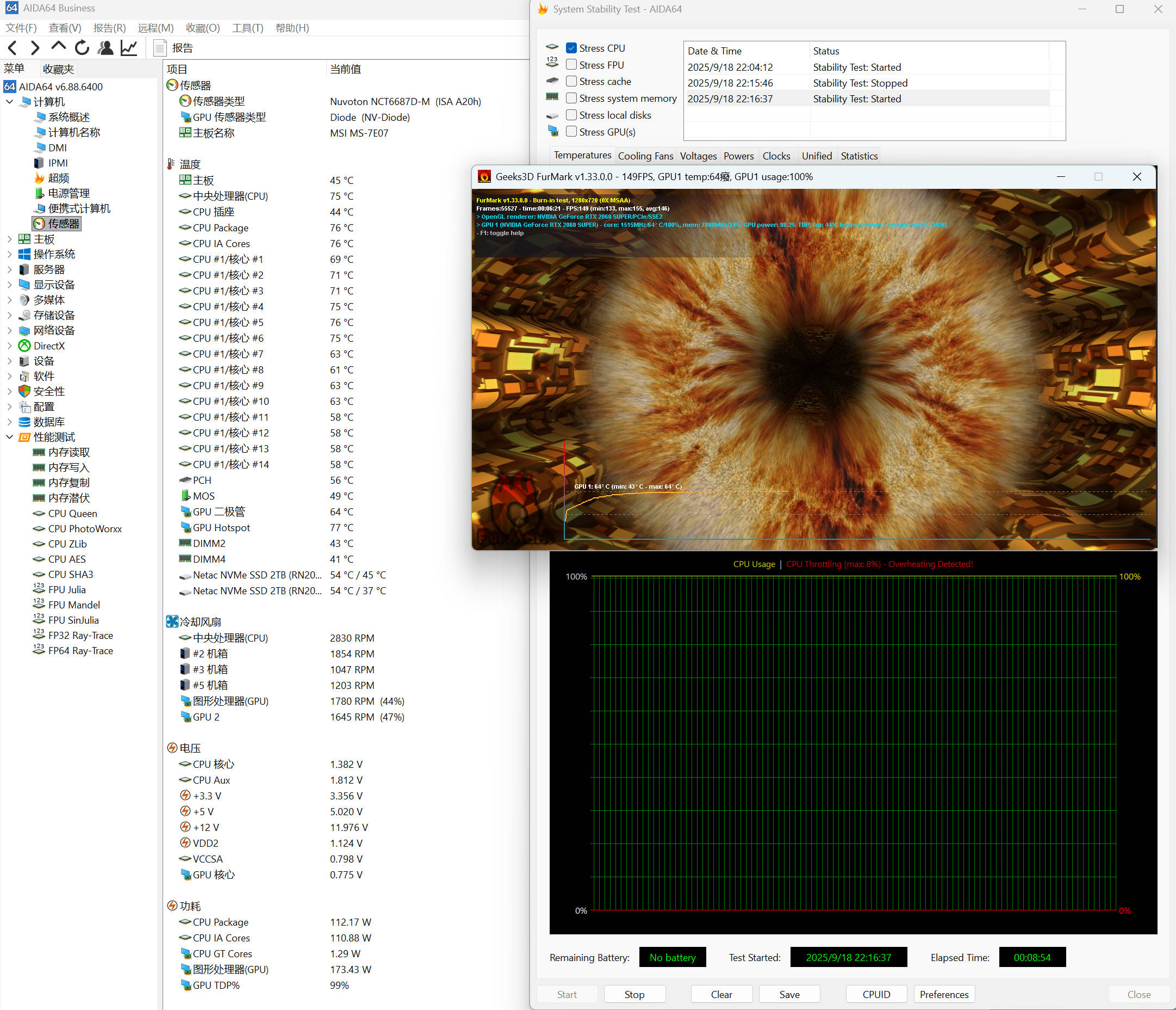 双烤CPU和GPU,CPU核心温度稳定在75℃,GPU核心温度77℃,整体数据表现都要强于之前的风冷散热。
