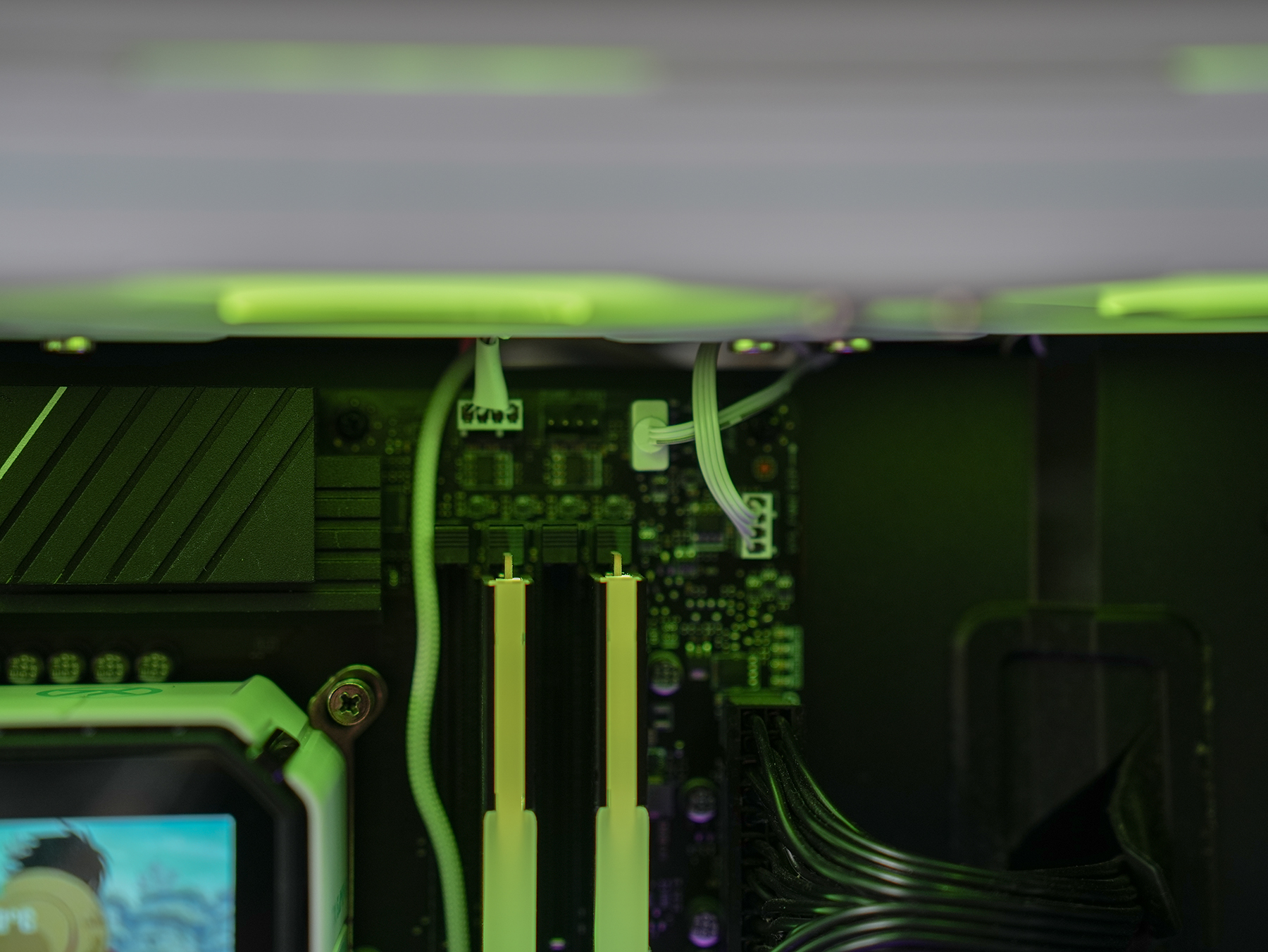 唯一让我觉得上了点强度的,可能就是如何把这水冷上的这四根线材隐藏起来,我的做法是从最近的安装孔绕到机箱背面,再从插口的位置绕回来插上,这样从正面看就没有那么多线材裸露。