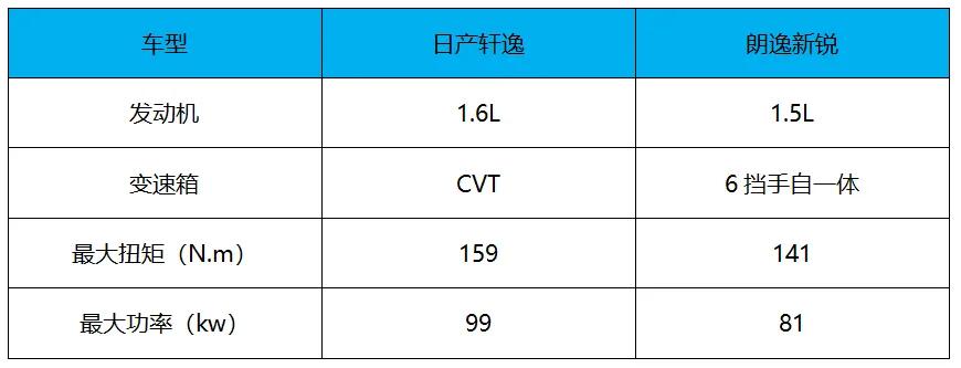 动力部分,日产轩逸搭载1.6L自吸发动机,最大功率99kW(135Ps),最大扭矩159N·m,匹配CVT变速箱。这套动力总成已经相当成熟,性能也可以满足日常代步的需求。其出色的可靠性、平顺性和燃油经济性。朗逸新锐搭载 1.5L自然吸气发动机,匹配6挡手自一体变速器,最大功率81kW、最大扭矩141N·m。朗逸新锐这套动力总成也是主打可靠性和经济性,从动力参数上看比轩逸经典略低一些。