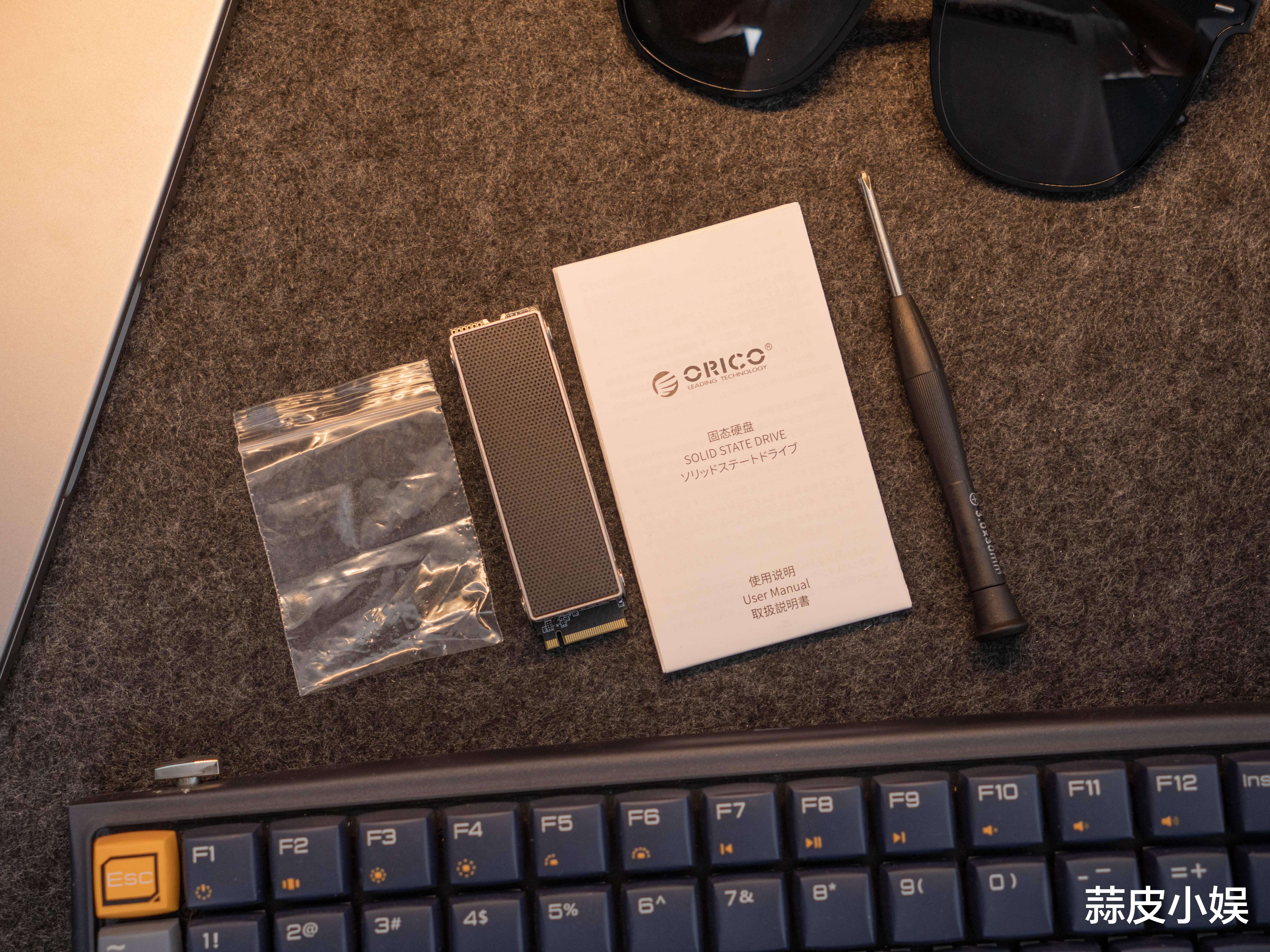 奥睿科ORICO的这块硬盘是非常有意思,出厂自带散热马甲。拆开包装,首先映入眼帘的并非裸露的PCB板,而是一件精密的“金属战甲”。这款采用2280规格(80×22mm)的M.2固态硬盘,在覆盖双层散热模组后厚度仅为14.5mm,重量控制在38.8克,兼容绝大多数主板M.2插槽空间。