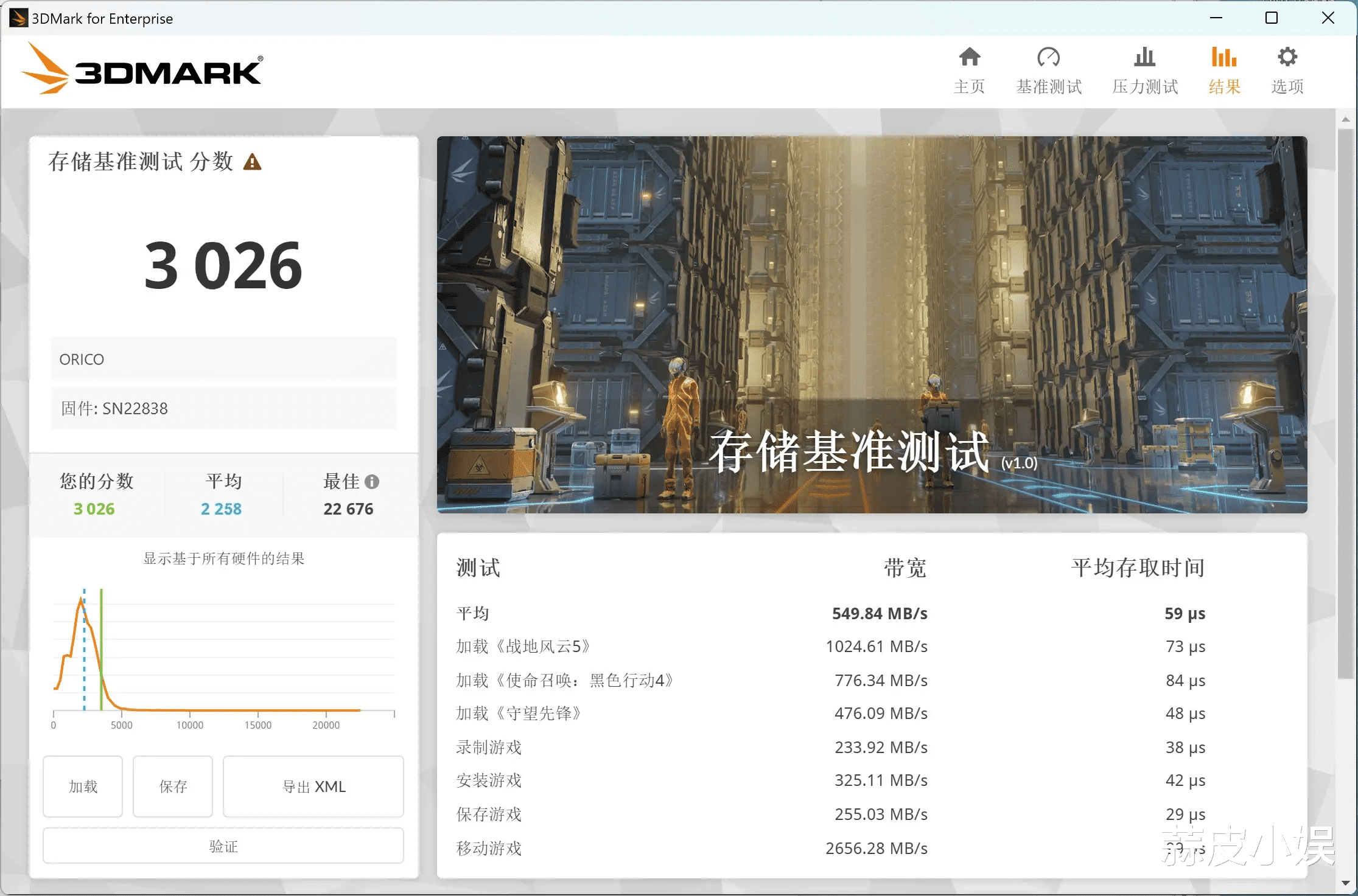 ATTO Disk Benchmark的读写曲线也非常平滑,峰值接近理论上限。在3DMark存储基准测试中,它获得了3026分的成绩,在同价位PCIe 4.0硬盘中位居前列。