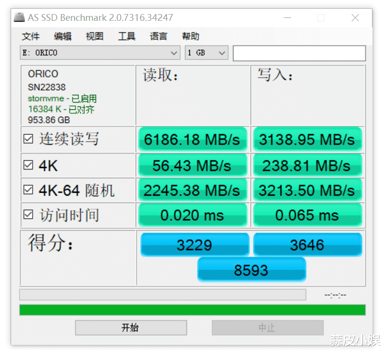 AS SSD Benchmark得分8593分,显示出优秀的随机读写能力。
