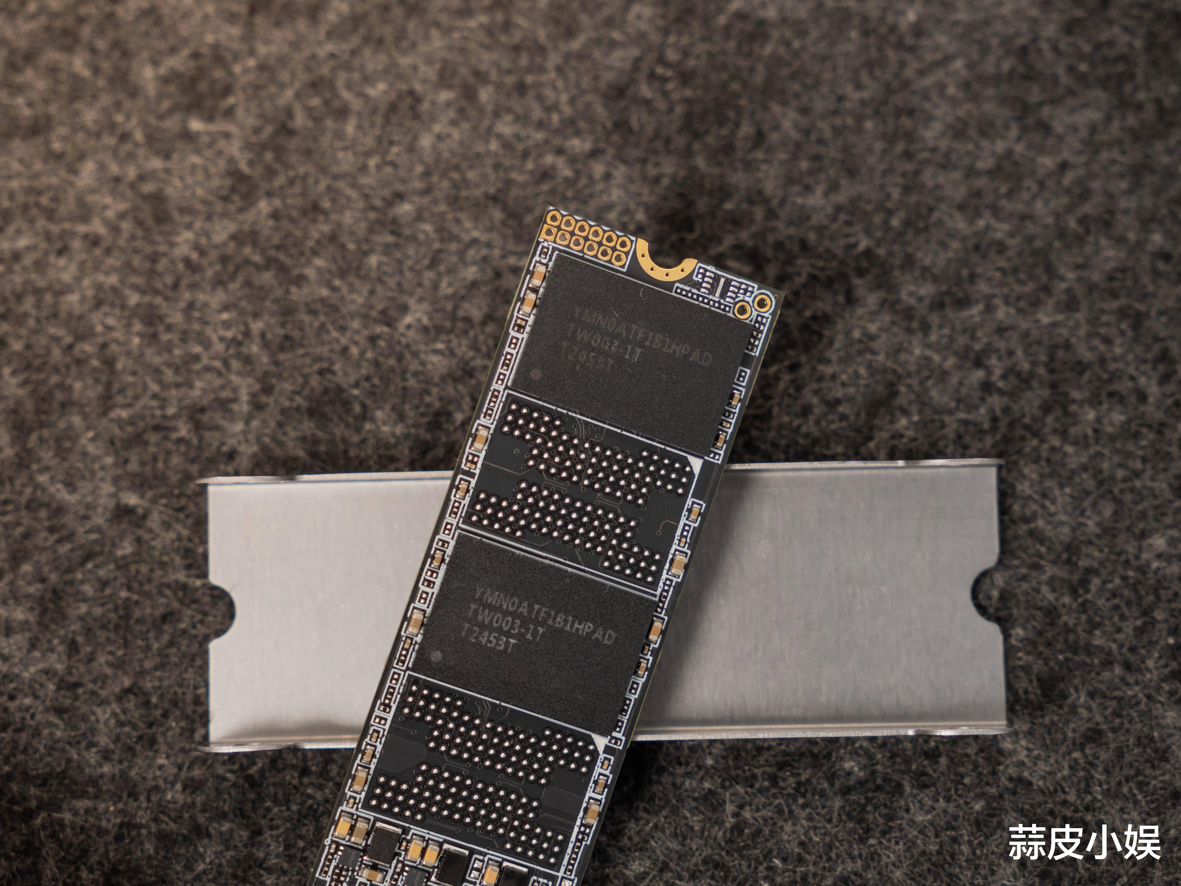 拆开散热装甲可以看到,奥睿科ORICO冰甲系列(型号OSC)固态硬盘使用了长江存储原厂TLC 3D NAND颗粒 (型号YMN0ATF1B1HPAD):基于晶栈Xtacking 3.0架构,通过晶圆键合技术将外围电路立体堆叠于存储单元上方,使晶圆有效面积提升25%以上,单颗芯片接口速度达2400MT/s 。单颗粒容量为500 GB,一共2颗,组成了1TB。