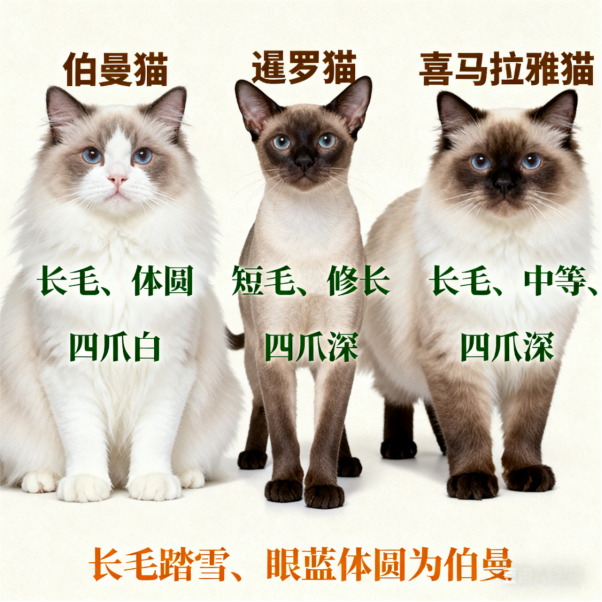 伯曼猫最易与暹罗猫、喜马拉雅猫混淆,可通过三大核心特征区分:
