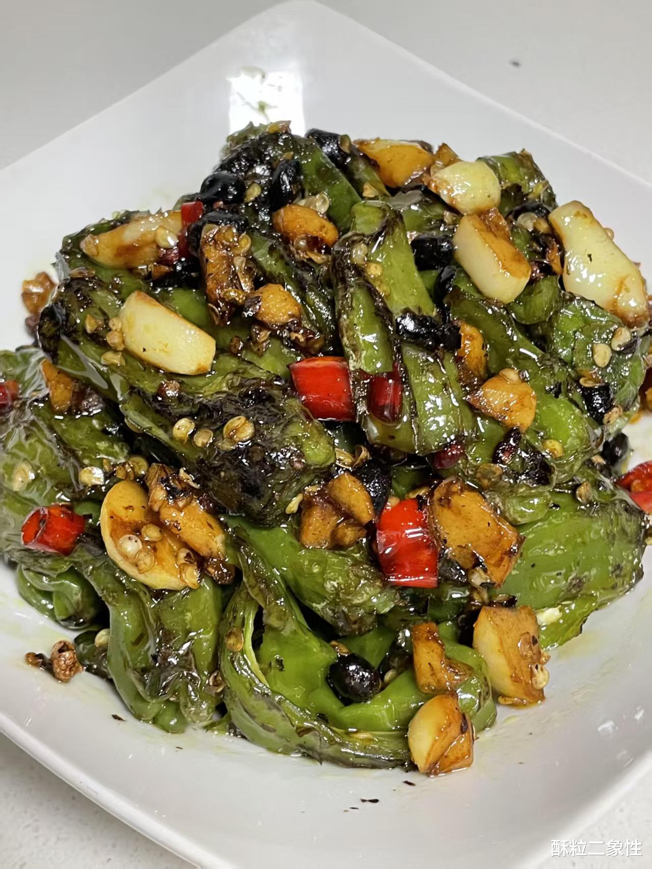 蒜粒、小米辣、豆豉、花椒是辣椒的闺蜜团,热油一泼,豆豉咕咚沉底翻出陈年酱香,花椒蹦跶几下,麻意像电流从舌尖窜到耳后。辣椒回锅,只一勺生抽、一点盐、半勺鸡精,颜色刷地亮起,虎皮纹里吸饱酱色,像给夜色补了腮红。