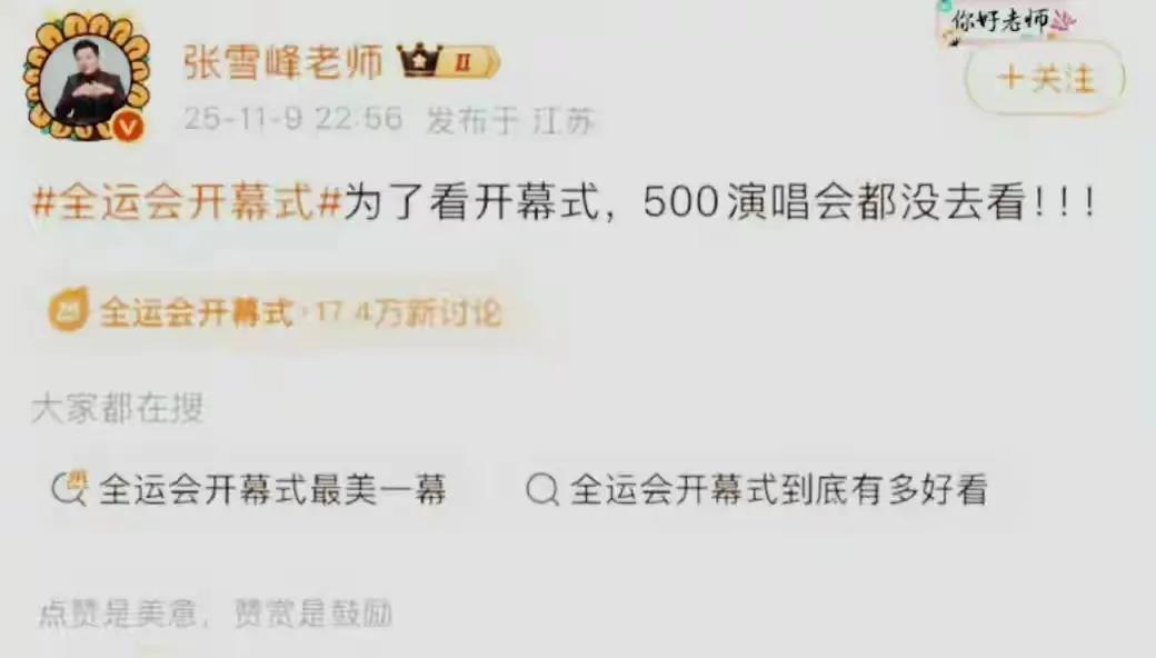当天晚上十一点左右,张雪峰在社交平台上发言感叹自己为了看全运会开幕式,连伍佰的演唱会都没去看。