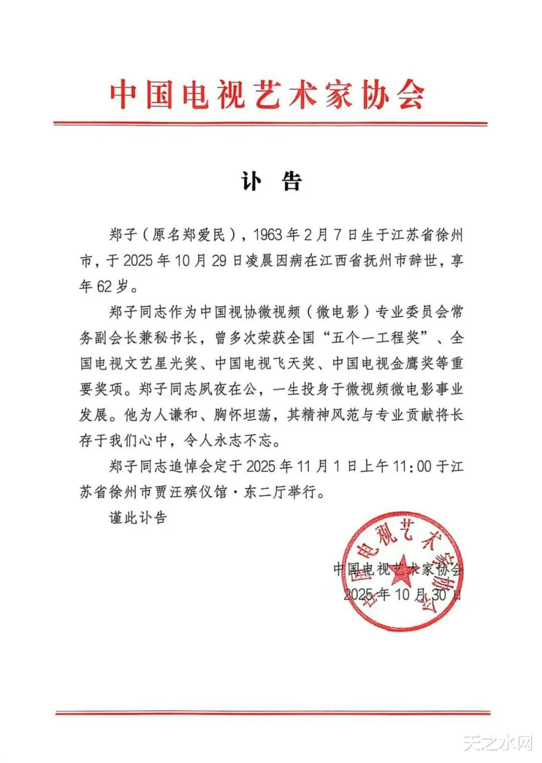 郑子(原名郑爱民),1963年2月7日生于江苏省徐州市,于2025年10月29日凌晨因病在江西省抚州市辞世,享年62岁。