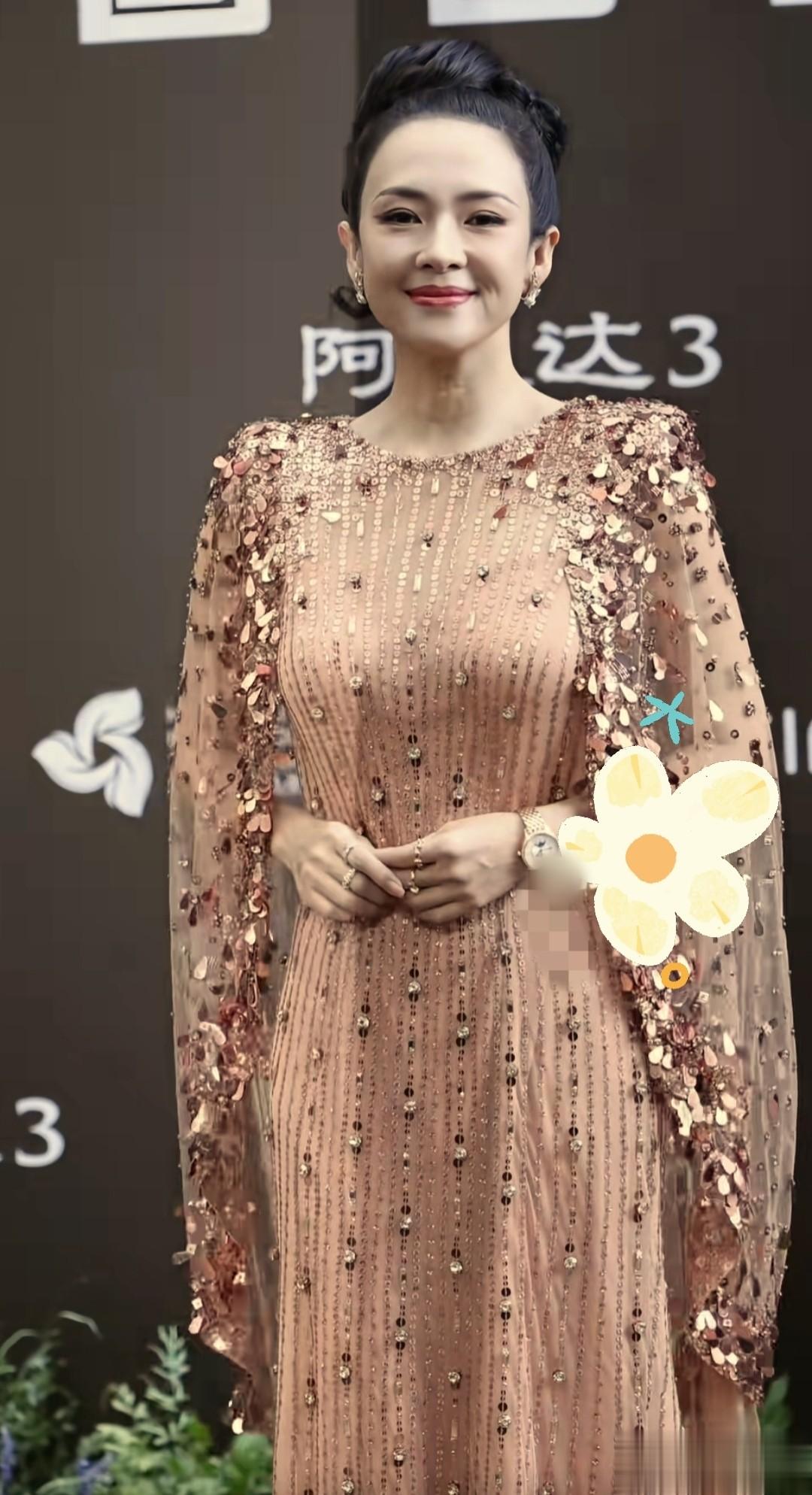 章子怡身着香槟粉长款礼服,长发向后挽着,妆容精致,舞台上,她面带微笑,站姿挺拔舒展,双手交叠在身前,优雅而高贵。