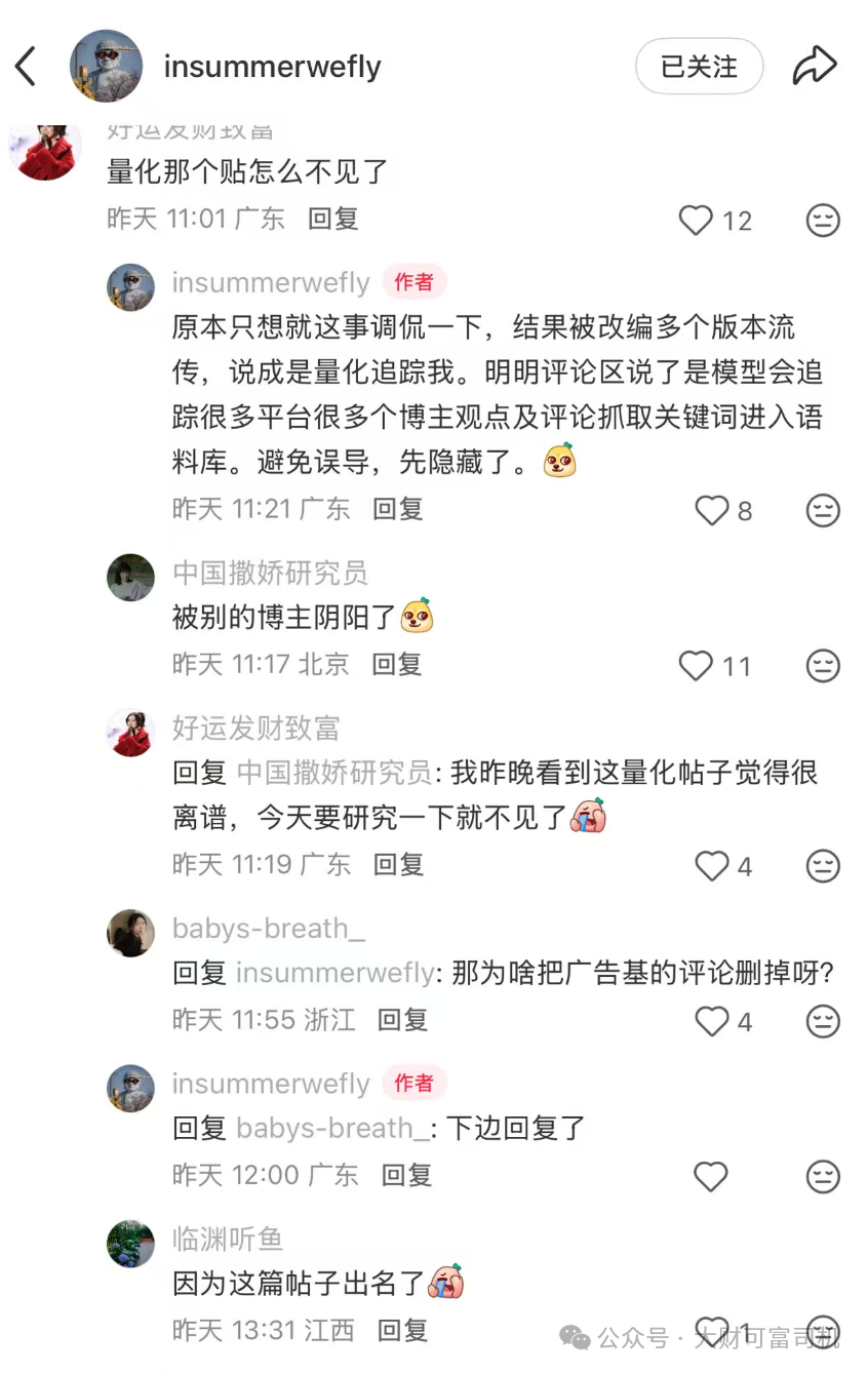更有意思的是,没过多久,insummerwefly就把“被量化盯上”的帖子删了,转头跟粉丝解释:“原本只想就这事调侃一下,结果被改编多个版本流传,说成是量化追踪我。明明评论区说了是模型会追踪很多平台很多个博主观点及评论抓取关键词进入语料库。避免误导,先隐藏了。”