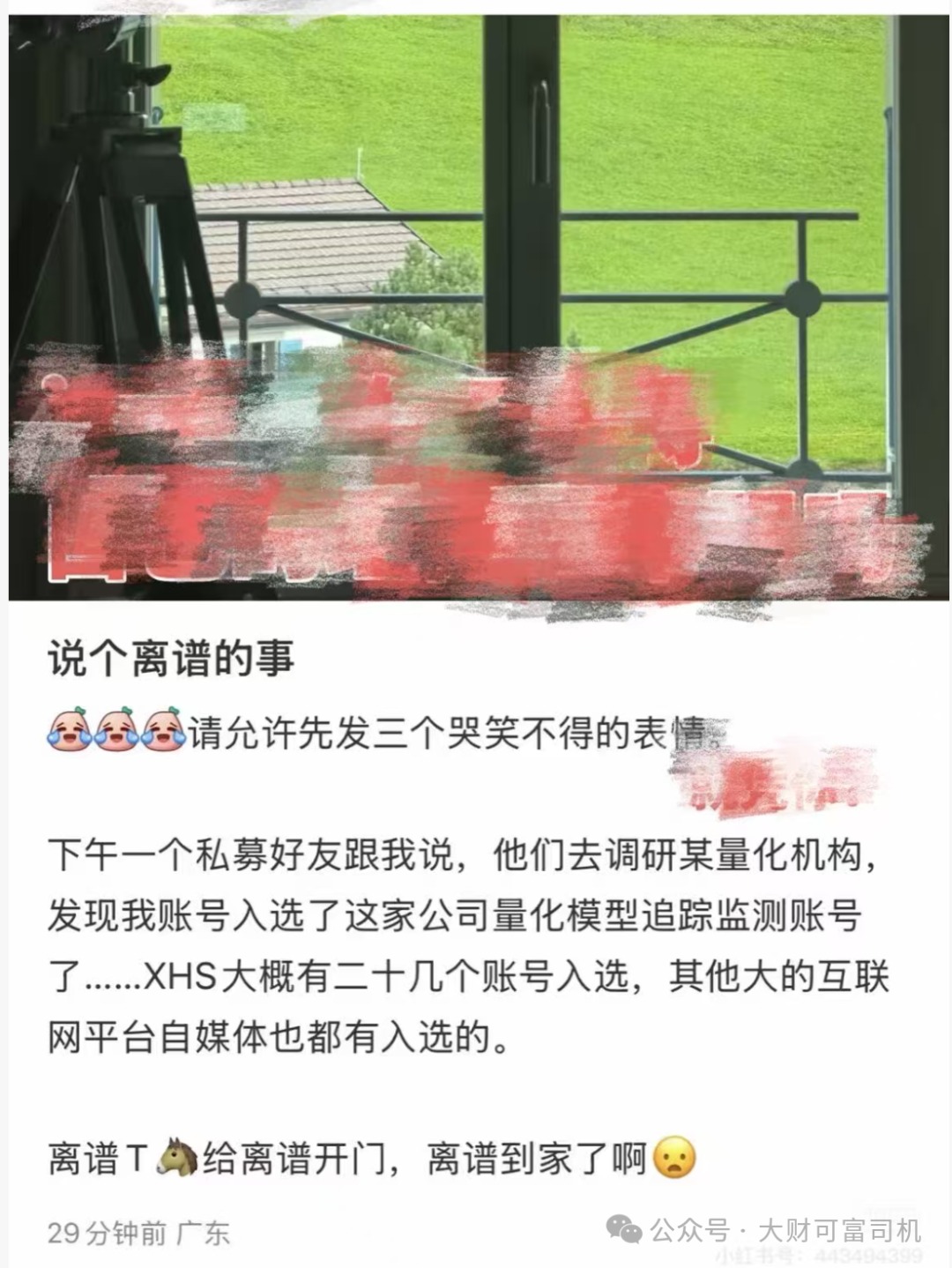 就在粉丝快沉不住气的时候,他前两天突然发了篇帖子《说个离谱的事》,说私募好友去调研量化机构时发现,他的账号入选了量化模型追踪监测账号,小红书还有二十多个同行 “入选”。