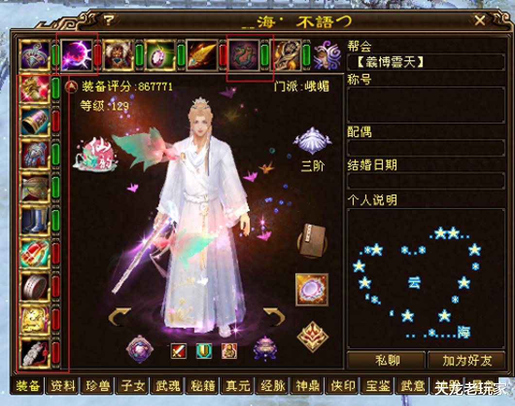 各位老铁,全服号品最强的男人又来了!前几年,我们就关注过拥有全服最多九星的人——来自【乔峰】服务器的三重楼峨嵋海不语: