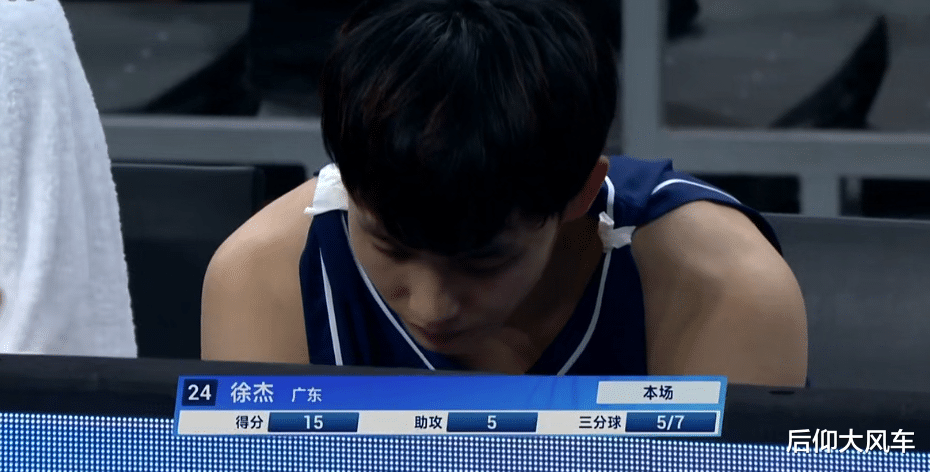 第二节中段,先前4中0的胡明轩终于投进打板三分有所贡献,杜锋趁热打铁换上刘传兴,丁伟也换上有伤在身走路一瘸一拐的程帅澎(这是招败笔),接下来广东队进攻全面复苏,大刘上来就有贡献制造2+1,贺希宁也成功打出转换,4分30秒徐杰再中三分,广东队一波11-1领先来到40-28。