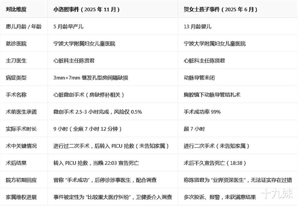 如今得知小洛熙的遭遇,贺女士联想到自己的女儿,痛心疾首。她指出,两起事件有四大惊人相似点:术前均承诺高成功率,实际手术时长远超预估的 2 小时,术中都进行了未告知家属的二次手术,术后院方均未主动沟通回应。