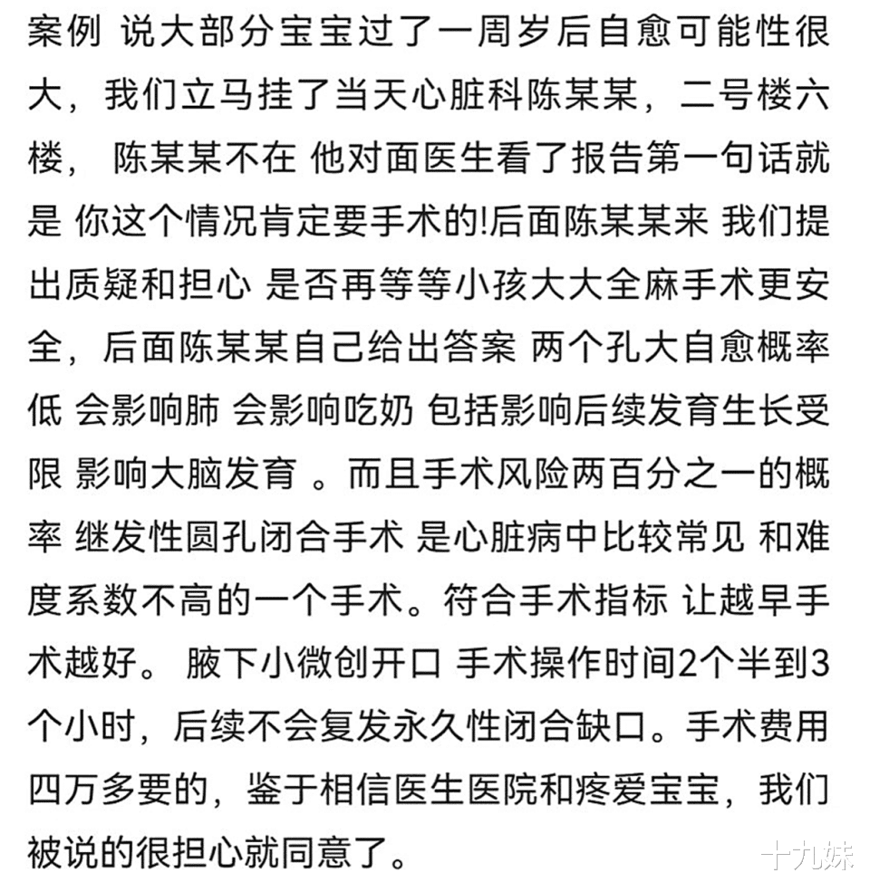 夫妻俩在网上查到,婴幼儿房缺 1 岁前自愈率极高,本想观察等待,却被宁波大学附属妇女儿童医院心脏科主任陈贤君的话打消了念头。