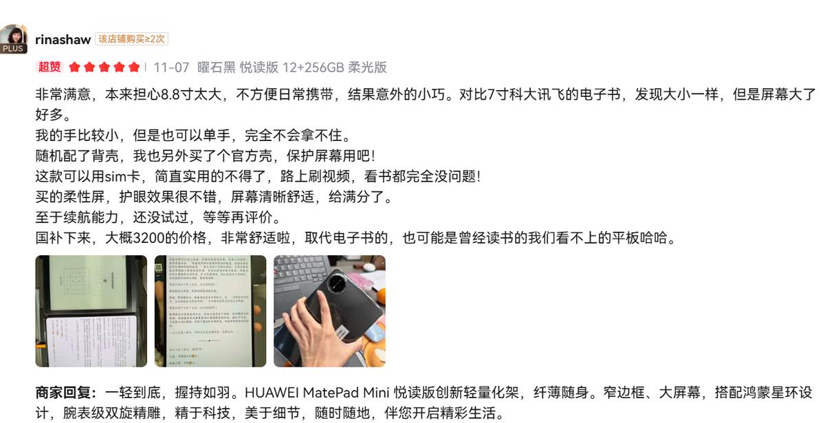 在快节奏的都市生活中,通勤减负是打工人的刚需。对于华为MatePad Mini,用户提及频率最高的好评点就是其极致的轻薄设计。“我的手比较小,但是也可以单手,完全不会拿不住。这款可以用sim卡,简直实用的不得了,路上刷视频,看书都完全没问题!”一位用户在京东平台这样分享道。