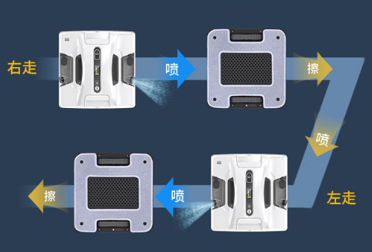 采用高密纤维清洁布,搭配玻璃水使用,可以清洁各种污渍、粉尘等污垢。而且清洁布可以多次反复使用,既环保又节约。内置风机吸附,并配备安全绳与断电续吸功能,保障基础作业安全。通常支持通过遥控控制喷水,或采用持续性渗水设计,保持抹布湿润,完成湿擦任务。美中不足在更光滑或略有弧度的玻璃上,脱落风险会增加。