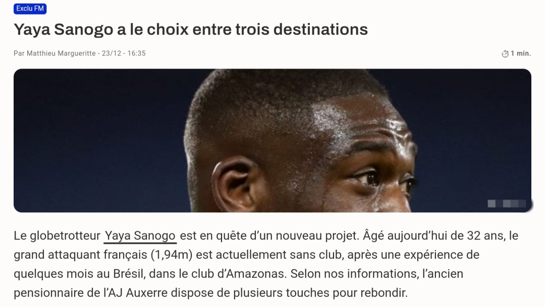 2025年12月24日,据法国媒体“Foot Mercato”最新消息,身高1米94的前阿森纳前锋亚亚-萨诺戈可能会加盟中国球队。据了解,亚亚-萨诺戈已经收到了几份不同球队的报价,而他正在与中国、沙特和迪拜3支不同的球队进行深入谈判。去年2月28日,他曾效力于中甲球队青岛红狮,收获了6粒进球,对于中国足球联赛比较熟悉。也因如此,外界认为他再次返回中国踢球的可能性非常大。