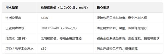不同用水场景对总硬度要求不同,国标明确核心限值如下,超限时需启动软化处理: