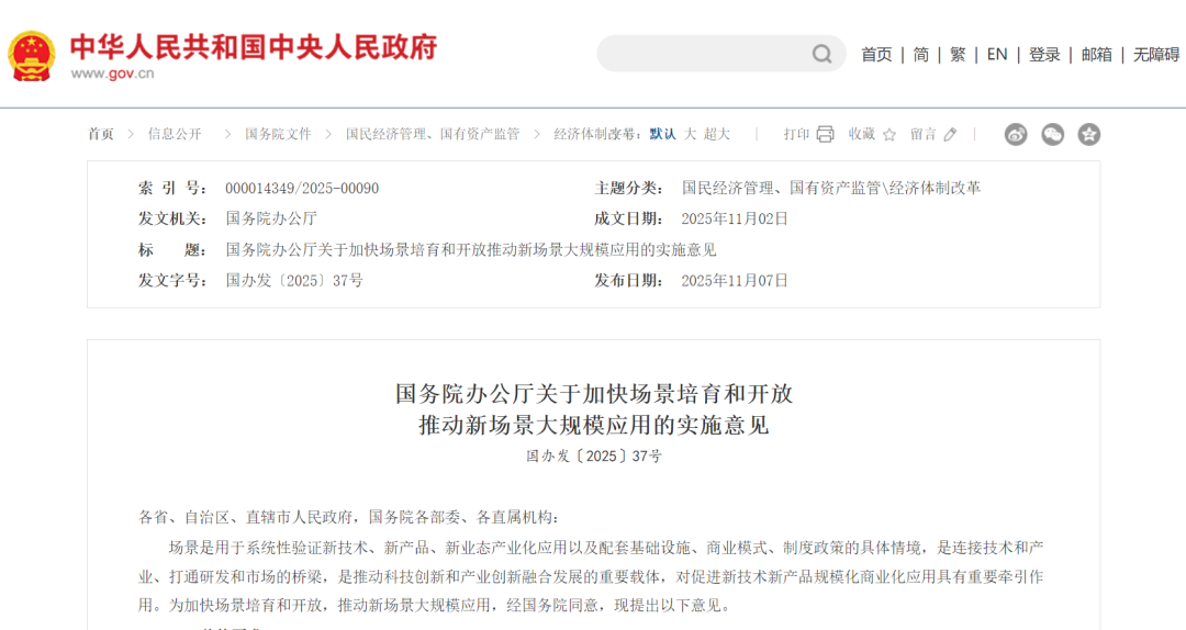 11月7日,国务院办公厅发布《关于加快场景培育和开放 推动新场景大规模应用的实施意见》。