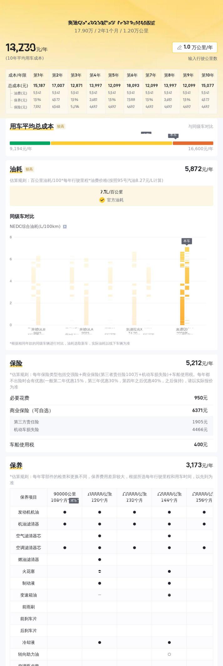 根据一年2万公里的行驶里程计算,这辆奥迪Q3的年均用车成本大约为13678元,其中包括燃油费、保险费、保养费等。这个数字对于一辆豪华品牌SUV来说,还是比较合理的。当然,具体的用车成本还会受到驾驶习惯、路况等因素的影响。