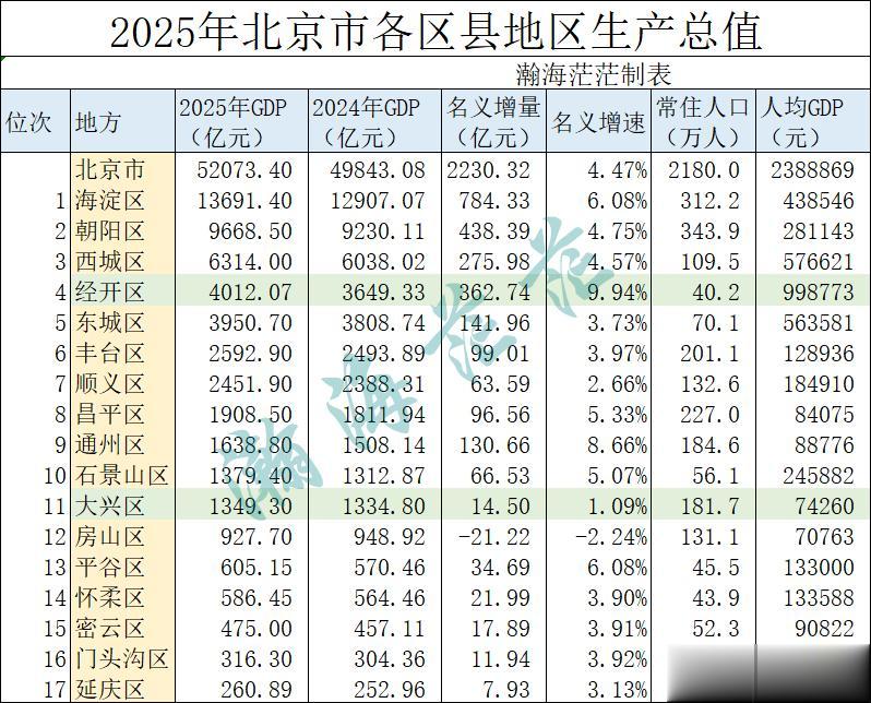 名义增速方面,经开区最高,达到了9.94%,通州区也超过8%,看来2025年北京市东部和东南发展比较迅速。