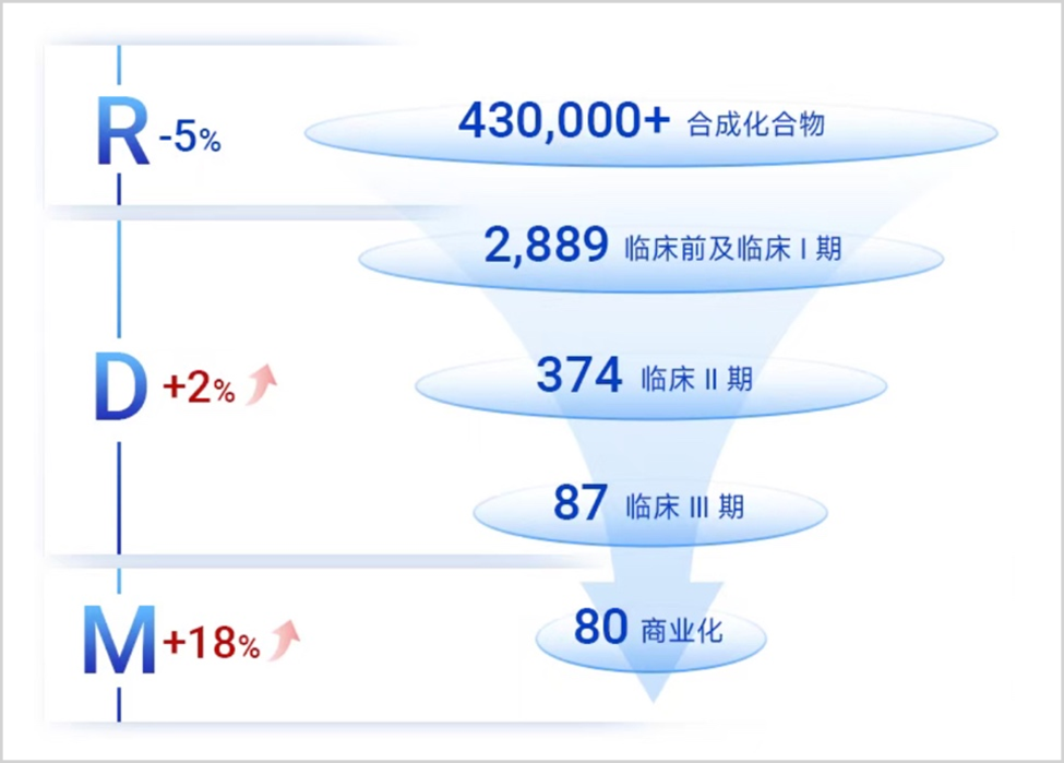 简单来说,该模式形成了一个“漏斗式”的模型,创新药物分子源源不断从漏斗上方的R(发现)端流向D(研发)端,再流向下方的M(生产)端,并在这个过程中逐级沉淀,业务价值量也在不断提升。