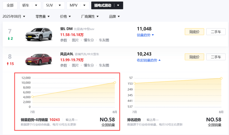 乍一看,奇瑞风云A9L这个定价并不怎么接地气,要知道“隔壁”吉利银河星耀8权益优惠后的起售价已经低至11.58万元起。那么问题来了,风云A9L凭何在上市第二个月就能实现月销量破万。作为了解,翻开2025年8月份中大型车细分市场销量排行榜数据,风云A9L当月售出10,243辆,当月市场表现好于银河星耀8和汉DM两款车型。而背后的销量逻辑,其实了解过这款车的朋友,都不难发现,同样的预算范围内,风云A9L似乎给的更多。