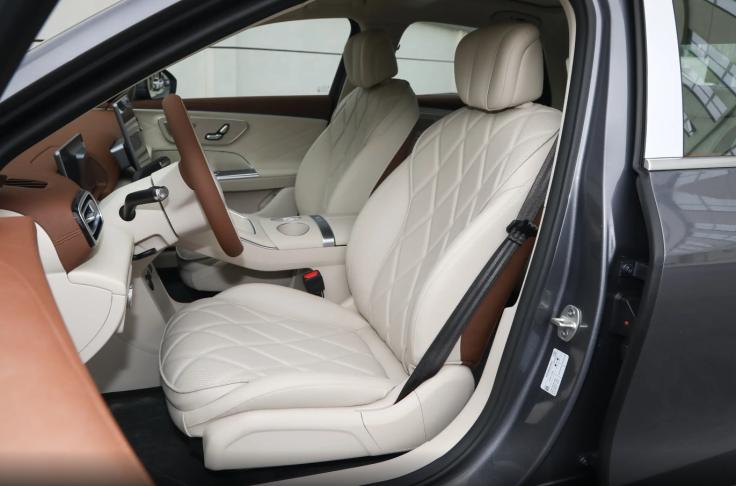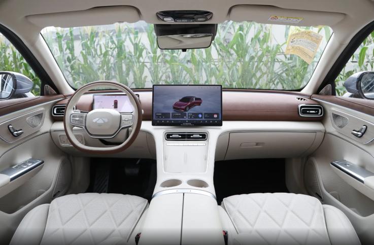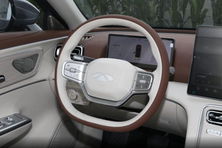 再看车内设计,风云A9L采用了相对年轻时尚的配色方案,乳白色软包材质与棕色仿皮革装饰相间,细节配以镀铬元素修饰,丰富了座舱的现代精致感。在门板区域扶手上方,镀铬座椅按键质感细腻,结合金属扬声器网罩来看,媲美德系豪华座舱设计。此外,双幅式多功能方向盘按键布局简洁易用,表面采用双层软包材质缝制包裹,触感温润舒适,握持手感也较为扎实。中控屏材质为LED,在色彩饱和度和清晰度方面要好于常见的LCD屏,车机内置骁龙8255芯片,算力表现好于市面上常见的骁龙8155座舱方案。