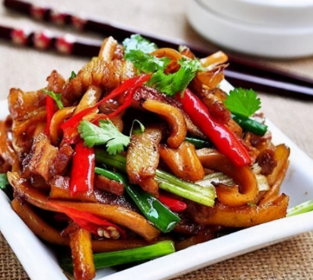 7、然后加配料合匀,烹入味汁。放入葱段,起锅前按照口味撒上花椒粉即可。