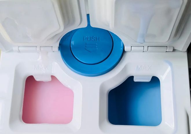 2、最中间放柔顺剂——这个格子里的洗涤剂,会在漂洗过程中被加入洗衣机,所以适合放柔顺剂这种需要残留的洗涤剂。要是在这里放了洗衣液,相当于漂洗的时候又加了洗衣液,岂不是越漂泡沫越多了?