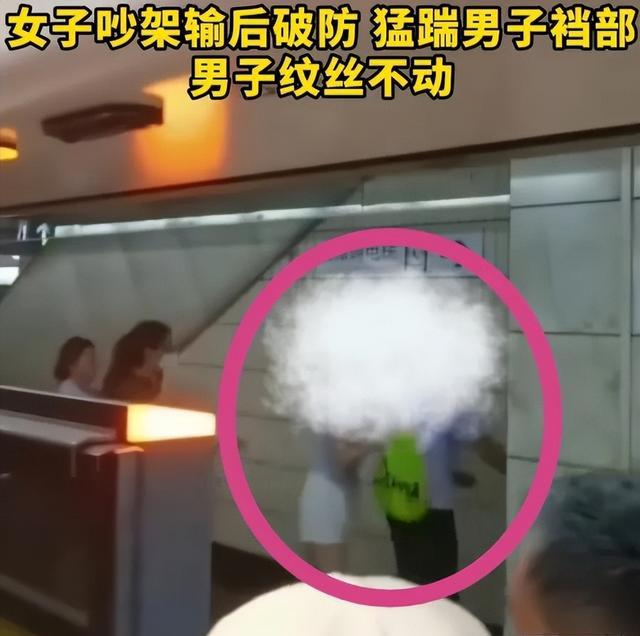 当女子看到语言攻击没有效果,突然开启了战斗模式,对着男子大腿和裆部连着踢踹了好多下。