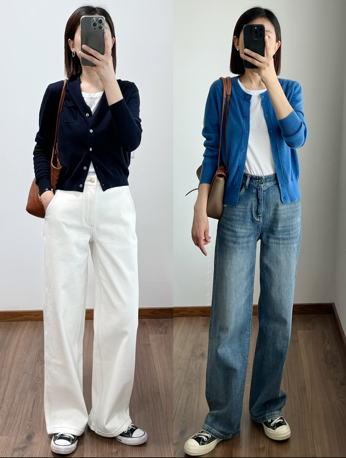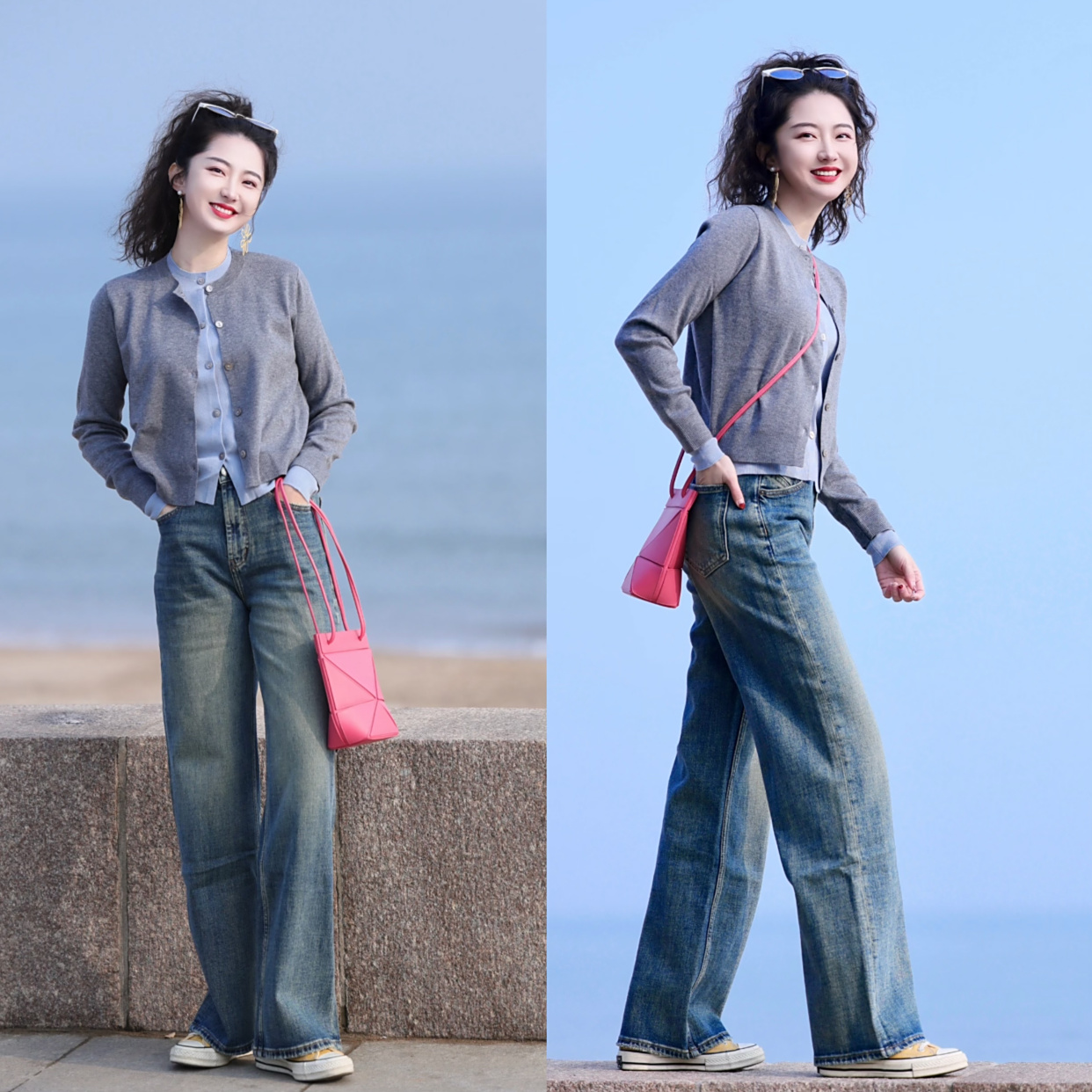对于没什么腰线的类型,短款开衫搭配高腰直筒裤真的是太友好了。比如灰色的开衫,内搭选同色系,搭配深浅不一的蓝色牛仔裤,整体看起来修长又有层次。开衫记得选一些有设计感的纽扣——小细节最提气质。