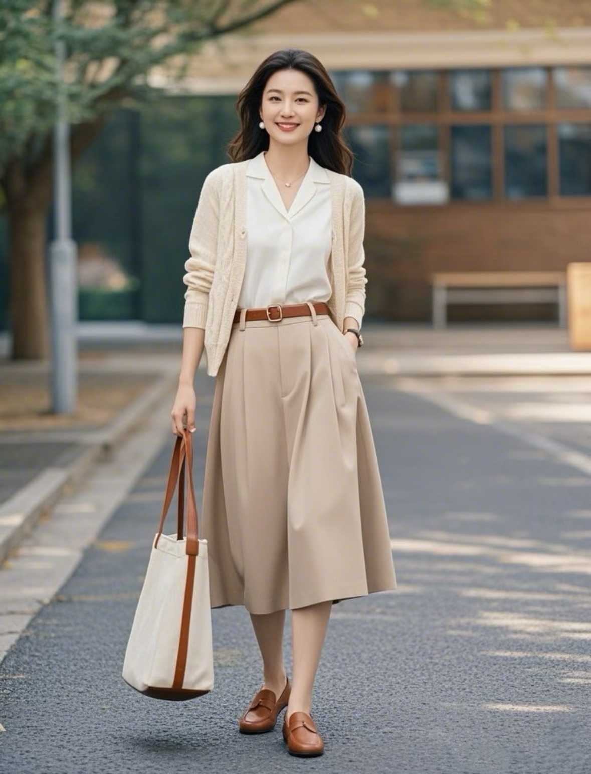穿搭示范:米色针织开衫 +同色系半身伞裙 ,相信我,这一套是真的能打。V领的白色衬衫作为内搭,巧妙拉长颈部线条,棕色腰带收敛视觉,提升轻盈感。最让我们惊喜的是,它遮肉又提气质,哪怕临时有个约会,也完全不输阵。
