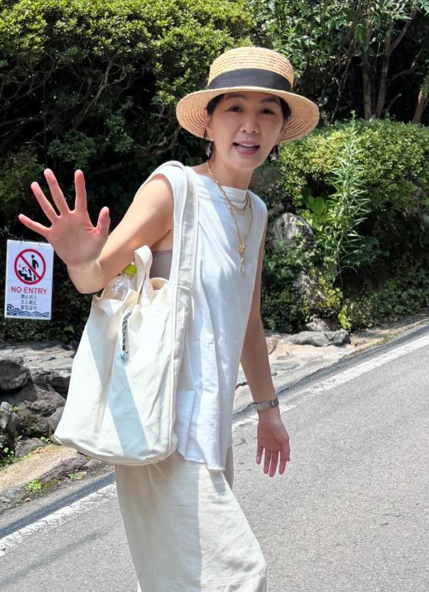 当时她打扮得特别随性,没化妆,戴着草帽,穿一件白色背心和棉麻长裤,脚踩一双普通运动鞋,肩上挎着一个帆布包,完全没有明星架子。