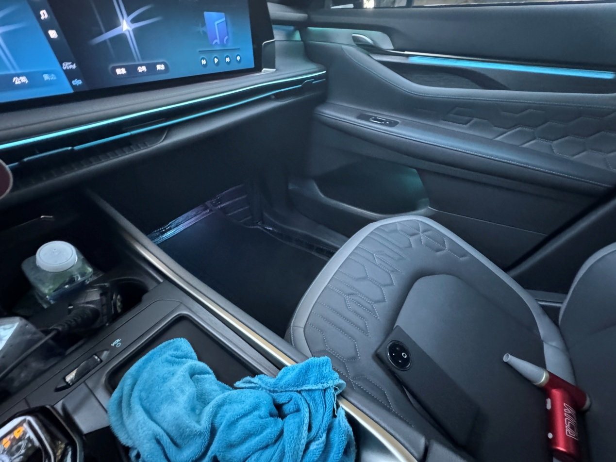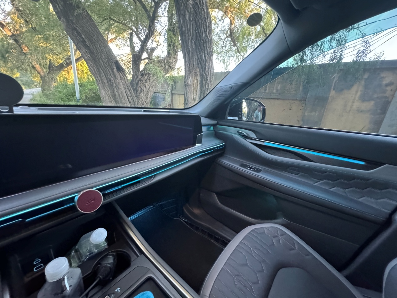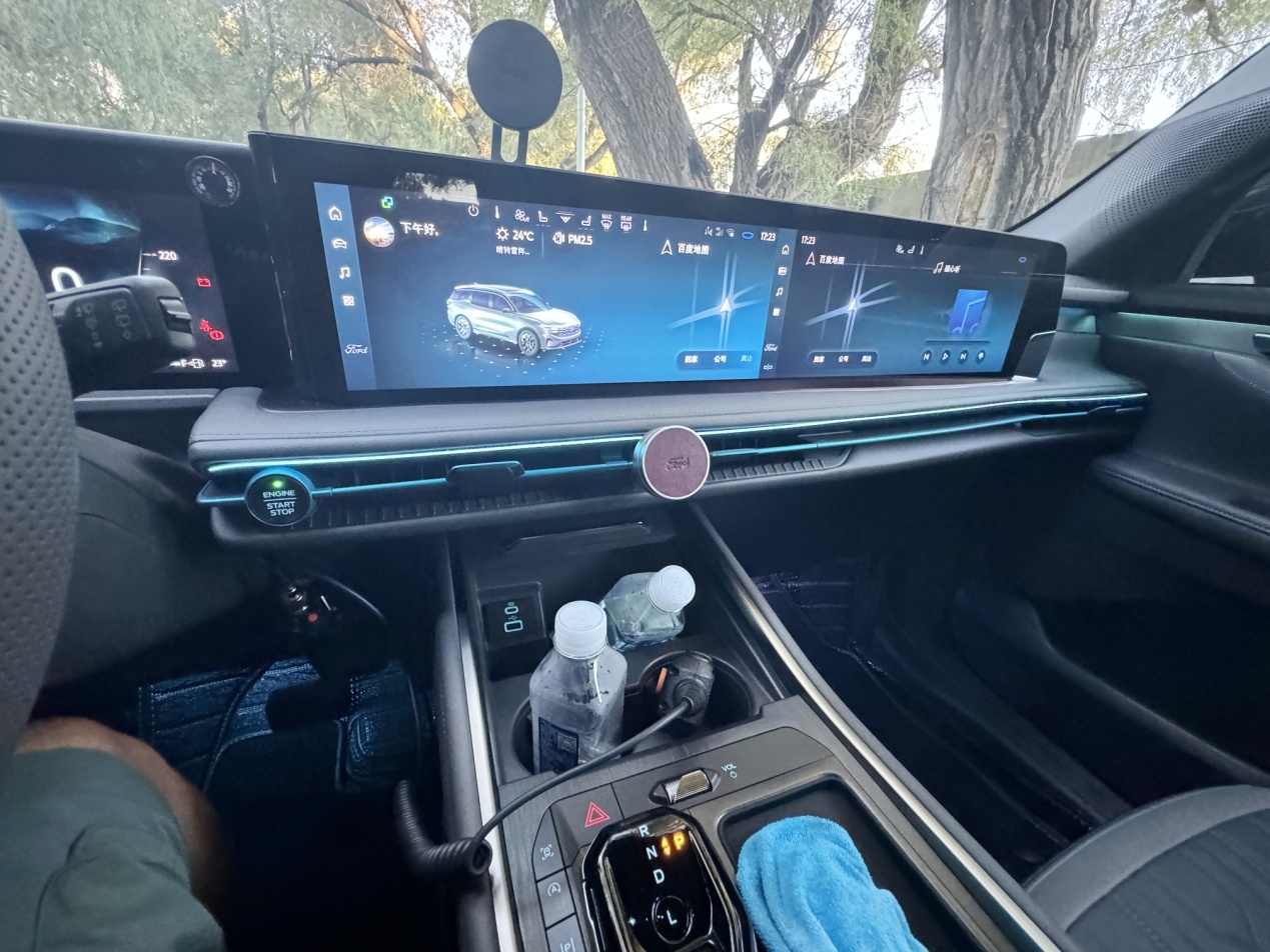 车内有点乱,主要是我好几天也不收拾一回,更重要的是我喜欢这种氛围感,12.3英寸的仪表盘,27英寸的中控大屏,百度地图,真皮把套,多功能方向盘,2.0T发动机加电动机加E-CVT的变速箱,这套动力总成,可以说是能文能武的,低速很丝滑,高速很奔放,踩就完了