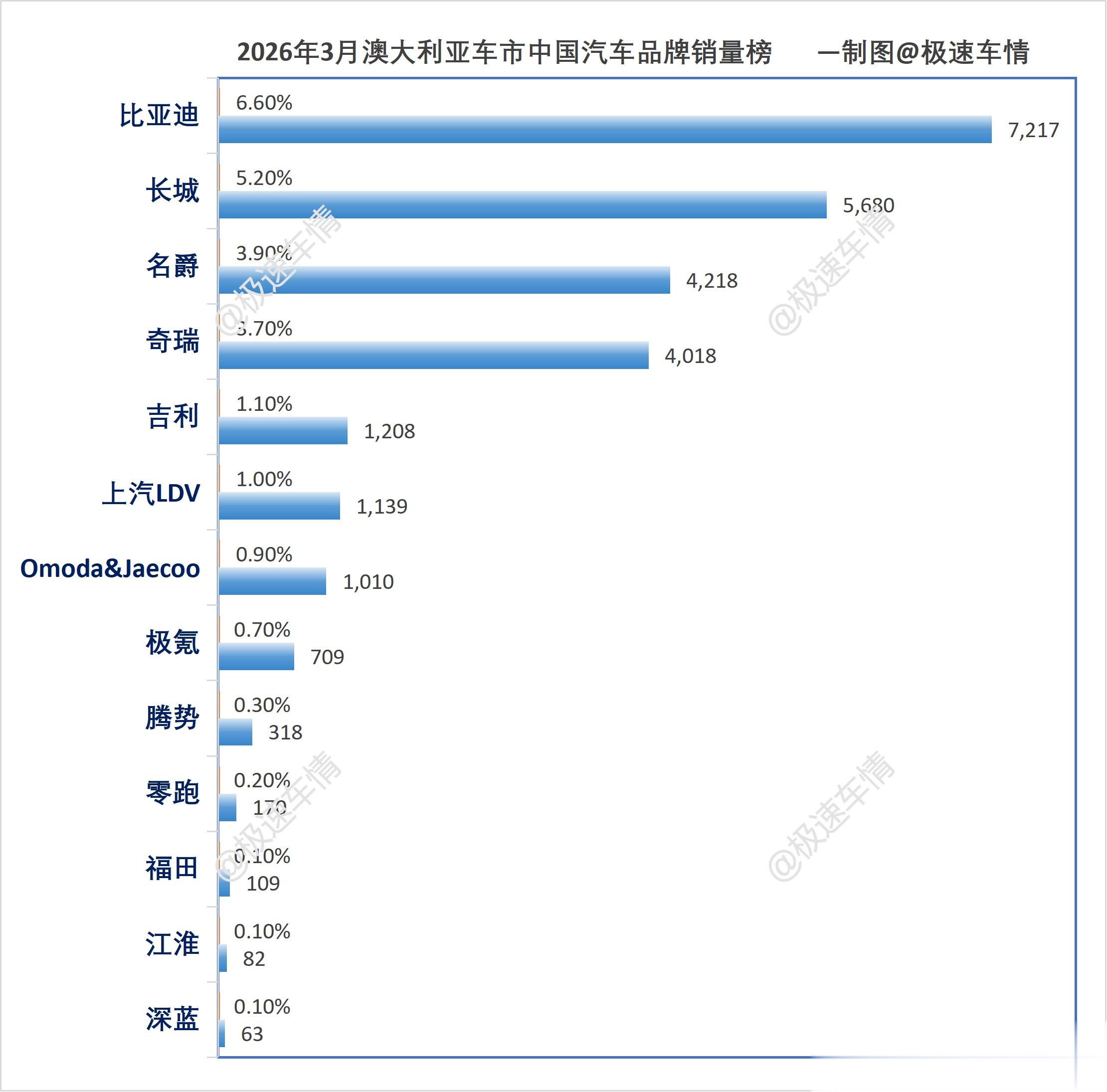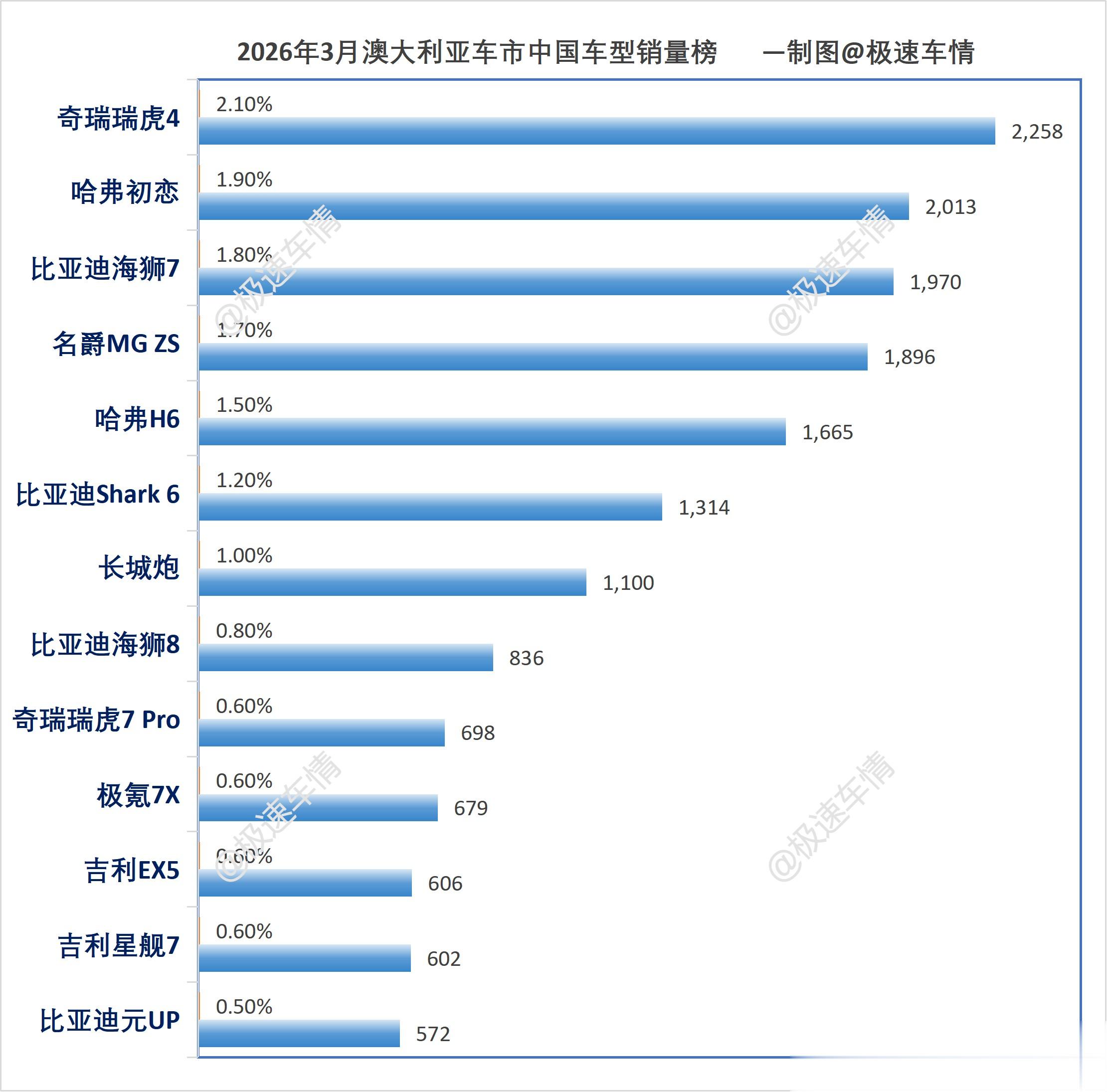 大家好,这里是极速车情。今天为大家带来澳大利亚汽车市场2026年3月的销量数据报告。