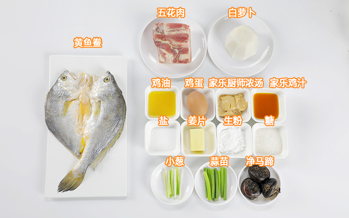 3另起锅下豆油,姜,葱,鸡汤800克,炸好的丸子,炖二十分钟后下萝卜,黄鱼鲞,小火再炖二十分钟调味即可;