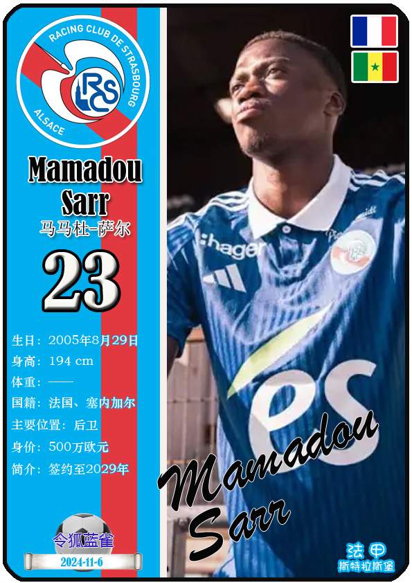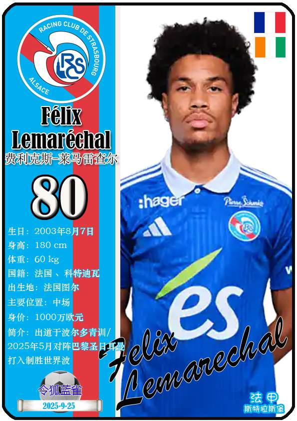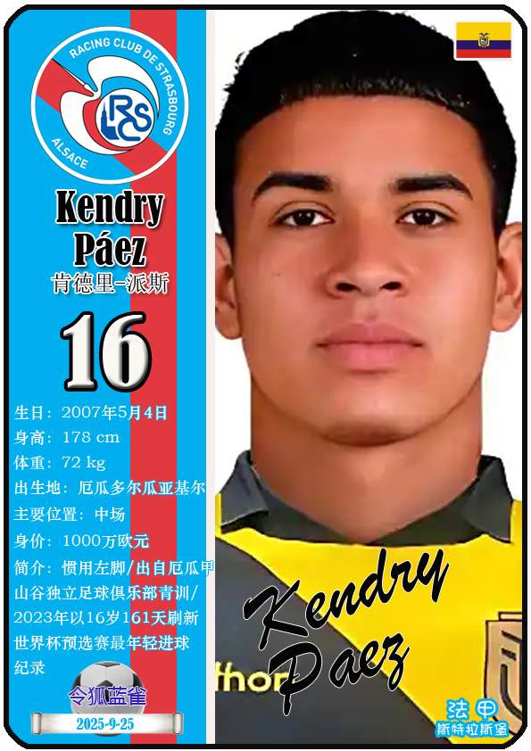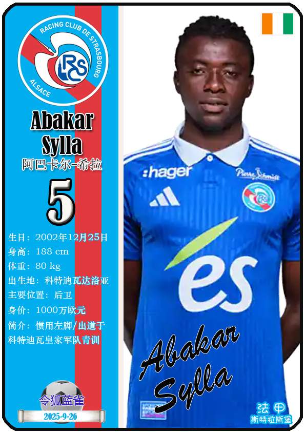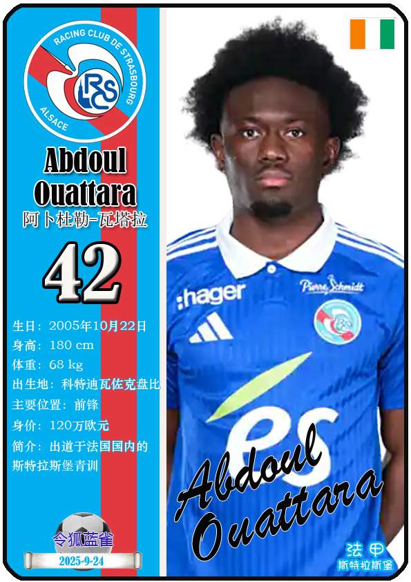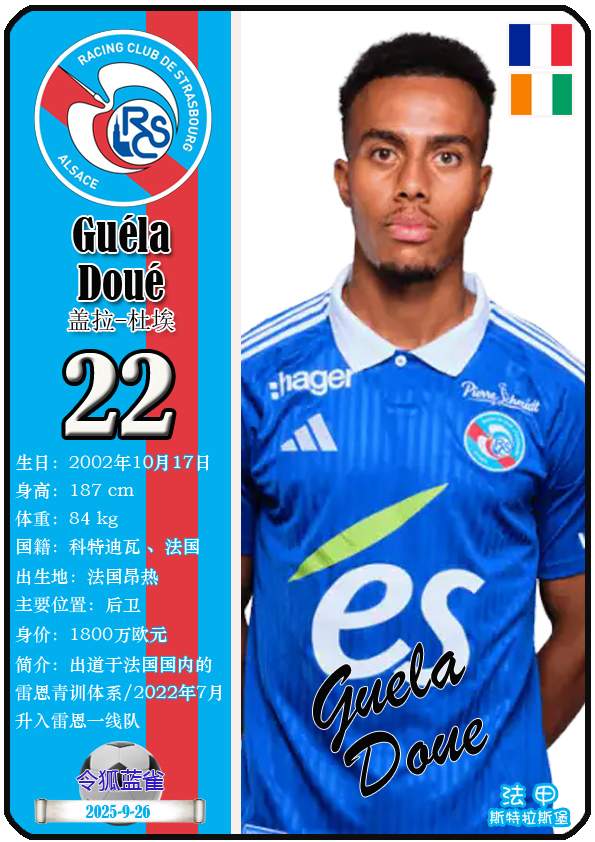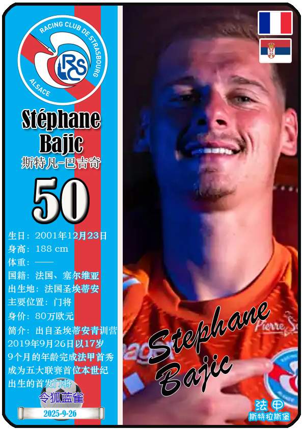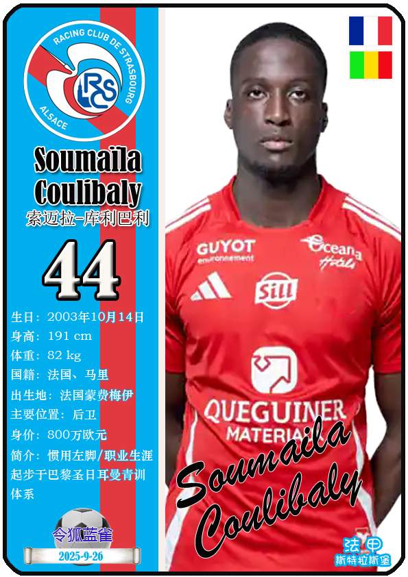 法甲斯特拉斯堡足球俱乐部的前身讷多夫足球俱乐部成立于1906年,距今已有119年历史。截至2025年9月26日,球队主教练是利亚姆-罗西尼尔,队内拥有球员伊曼纽尔-埃梅加、潘尼切利、伊斯梅尔-杜库雷等。本期以球星卡的形式展示目前法甲斯特拉斯堡足球俱乐部的26名球员(按球衣号码排序):