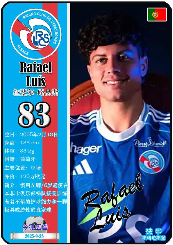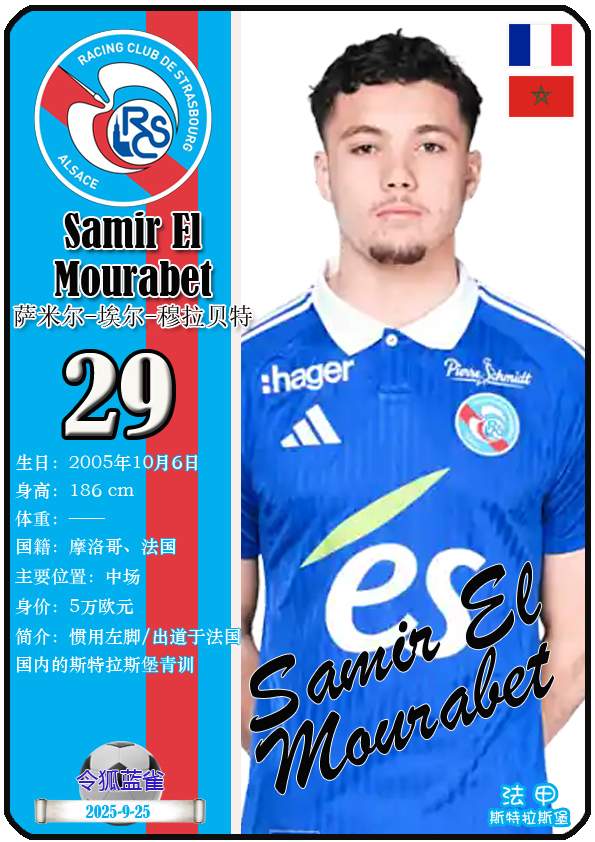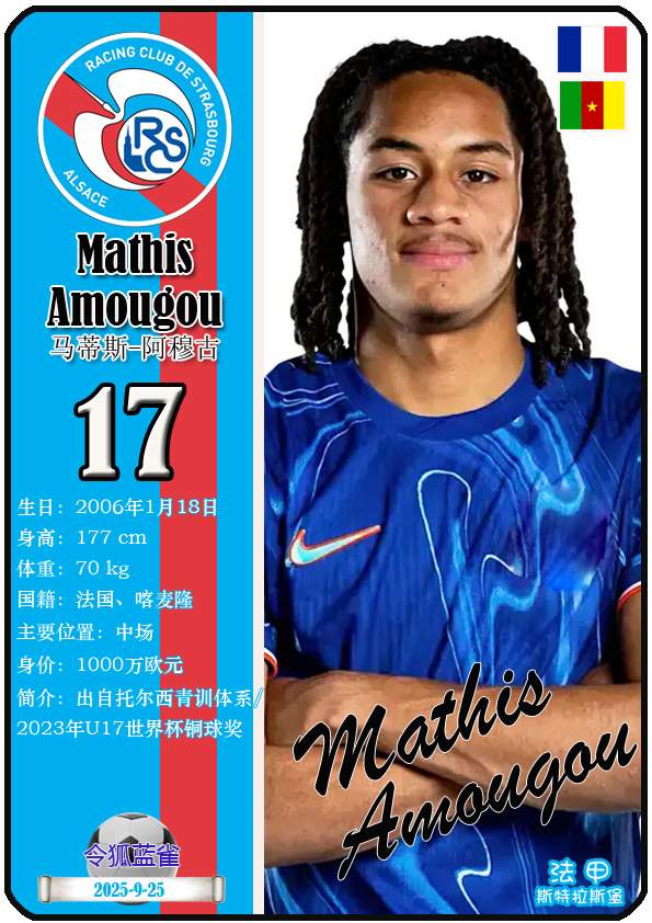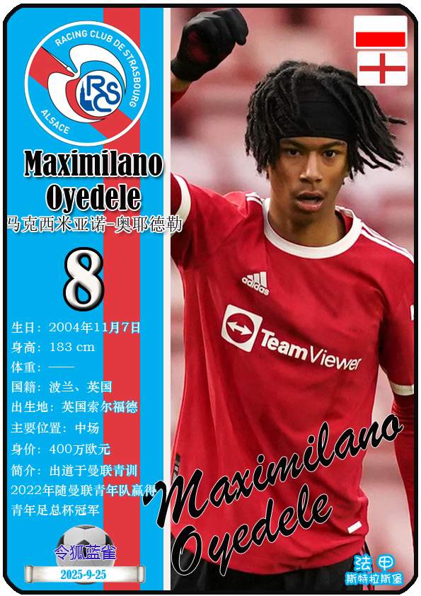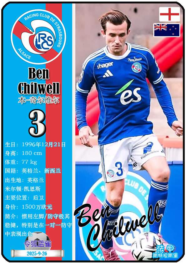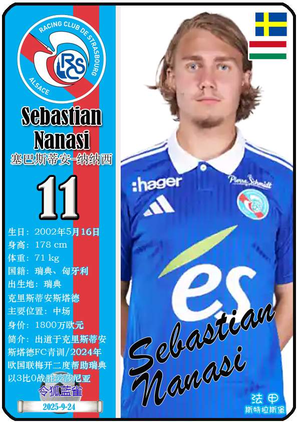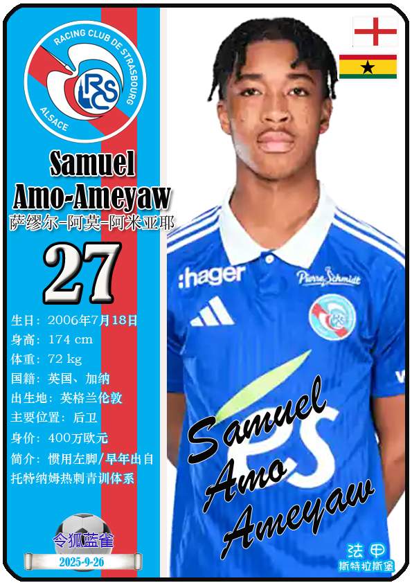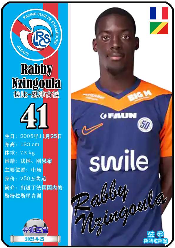 法甲斯特拉斯堡足球俱乐部的前身讷多夫足球俱乐部成立于1906年,距今已有119年历史。截至2025年9月26日,球队主教练是利亚姆-罗西尼尔,队内拥有球员伊曼纽尔-埃梅加、潘尼切利、伊斯梅尔-杜库雷等。本期以球星卡的形式展示目前法甲斯特拉斯堡足球俱乐部的26名球员(按球衣号码排序):