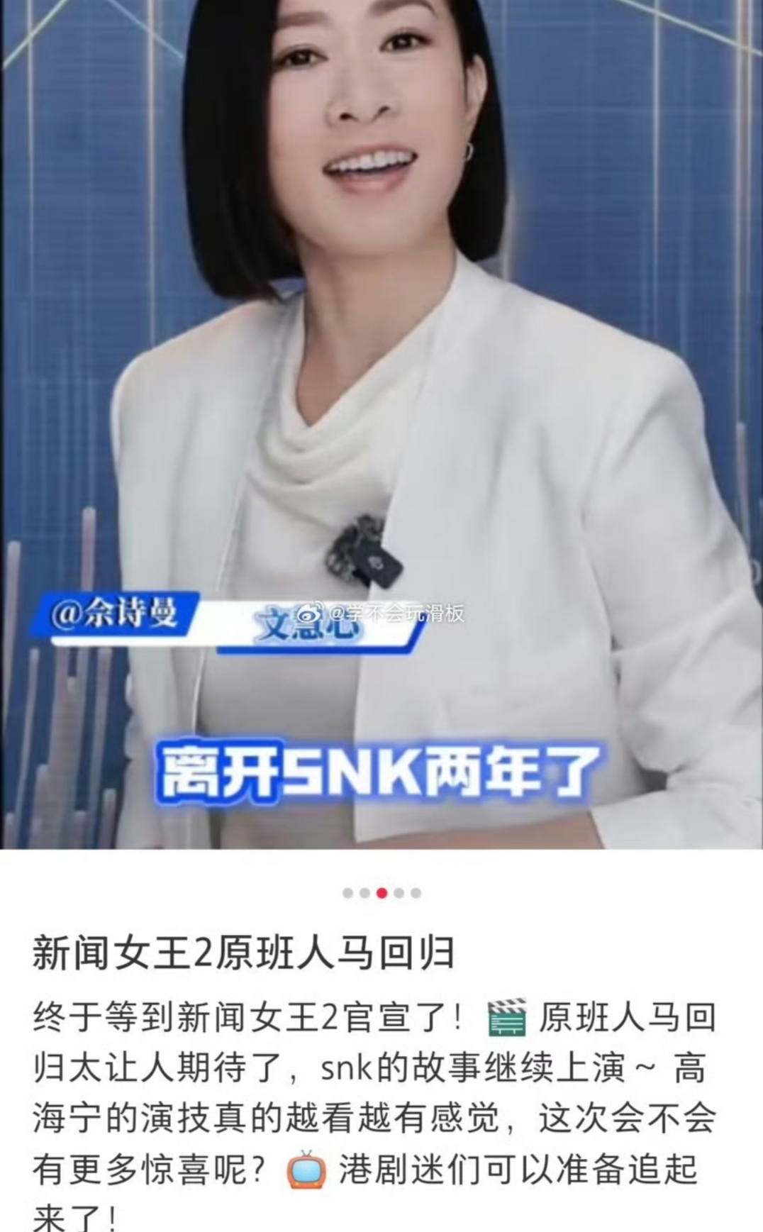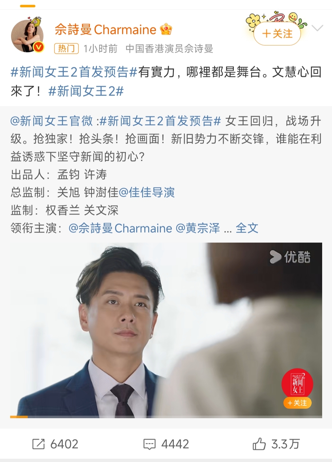 佘诗曼在个人微博账号发布动态:“有实力,哪里都是舞台”,配图是《新闻女王2》首支预告片中她身着干练西装、眼神凌厉的镜头。这条微博瞬间引爆热搜,TVB官方同步释出粤语版预告,确认该剧作为台庆剧将于11月初登陆荧屏。这场蓄势已久的“新闻女王”回归战,终于揭开帷幕。