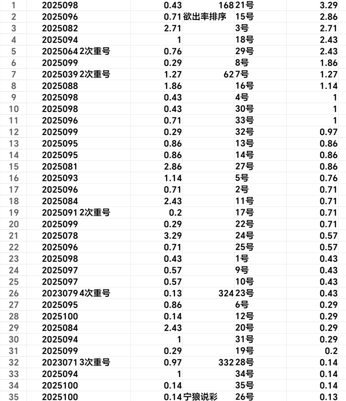 前区32号上次连续三期开出时间2023年第69~71期,3次重号当前遗漏(150-71+152+101)➗理论遗漏7➗7➗7≈欲出率0.97。