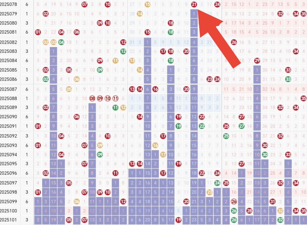 当前遗漏:自上次开出到当前期所间隔的期数。(例如:前区21号上次开出时间2025年第78期,当前开出2025年第101期,101-78=当前遗漏23期)