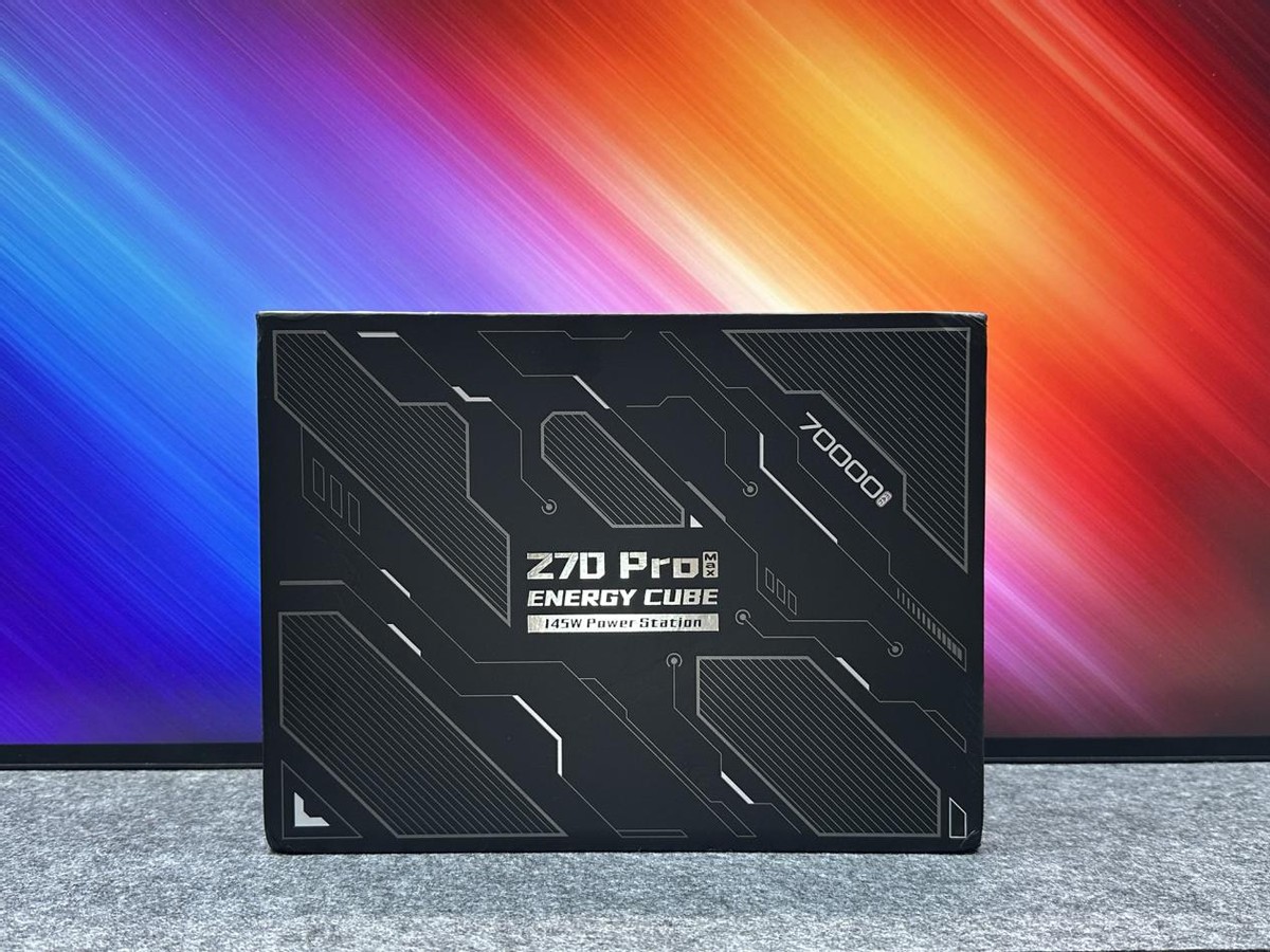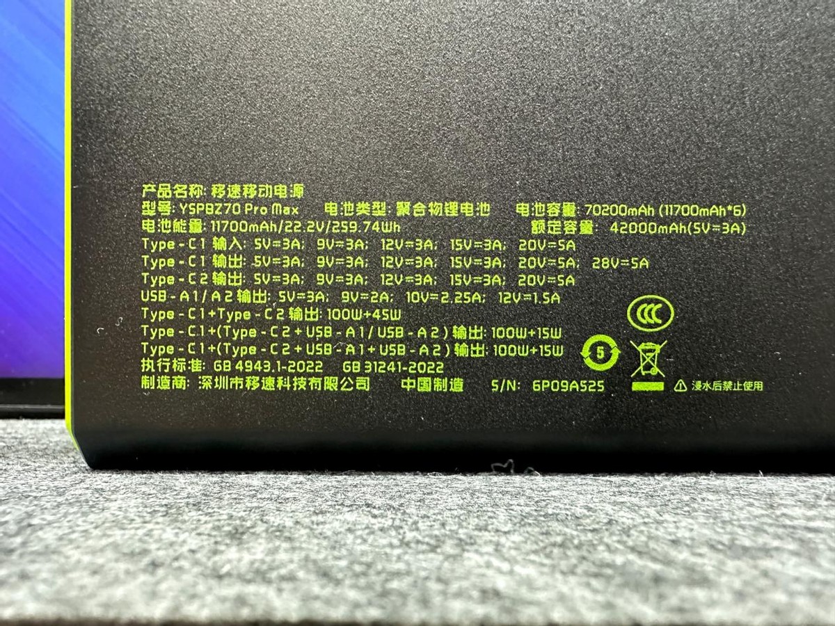 包装黑色主调给人一种高级神秘感。正面中间是产品的型号 :Z70 Pro Max,70000毫安时 的标识提醒这是一款能量巨无霸。白色的线描显得科技感十足。