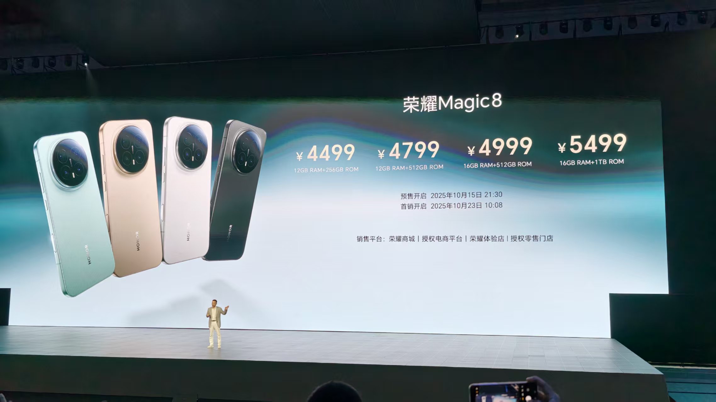 价格方面,荣耀Magic8起售价为4499元,顶配16GB+1TB版本售价5499元;荣耀Magic8 Pro起售价5699元,顶配6699元。