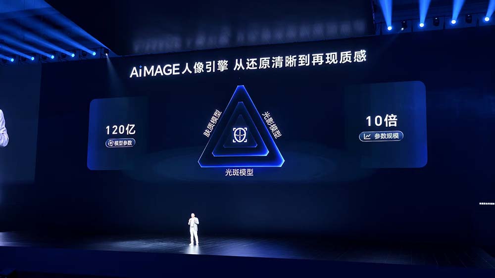 人像拍照方面,AIMAGE人像引擎中的模型参数达到了120亿,参数规模提升了10倍,包括肤质模型、光影模型、光斑模型。