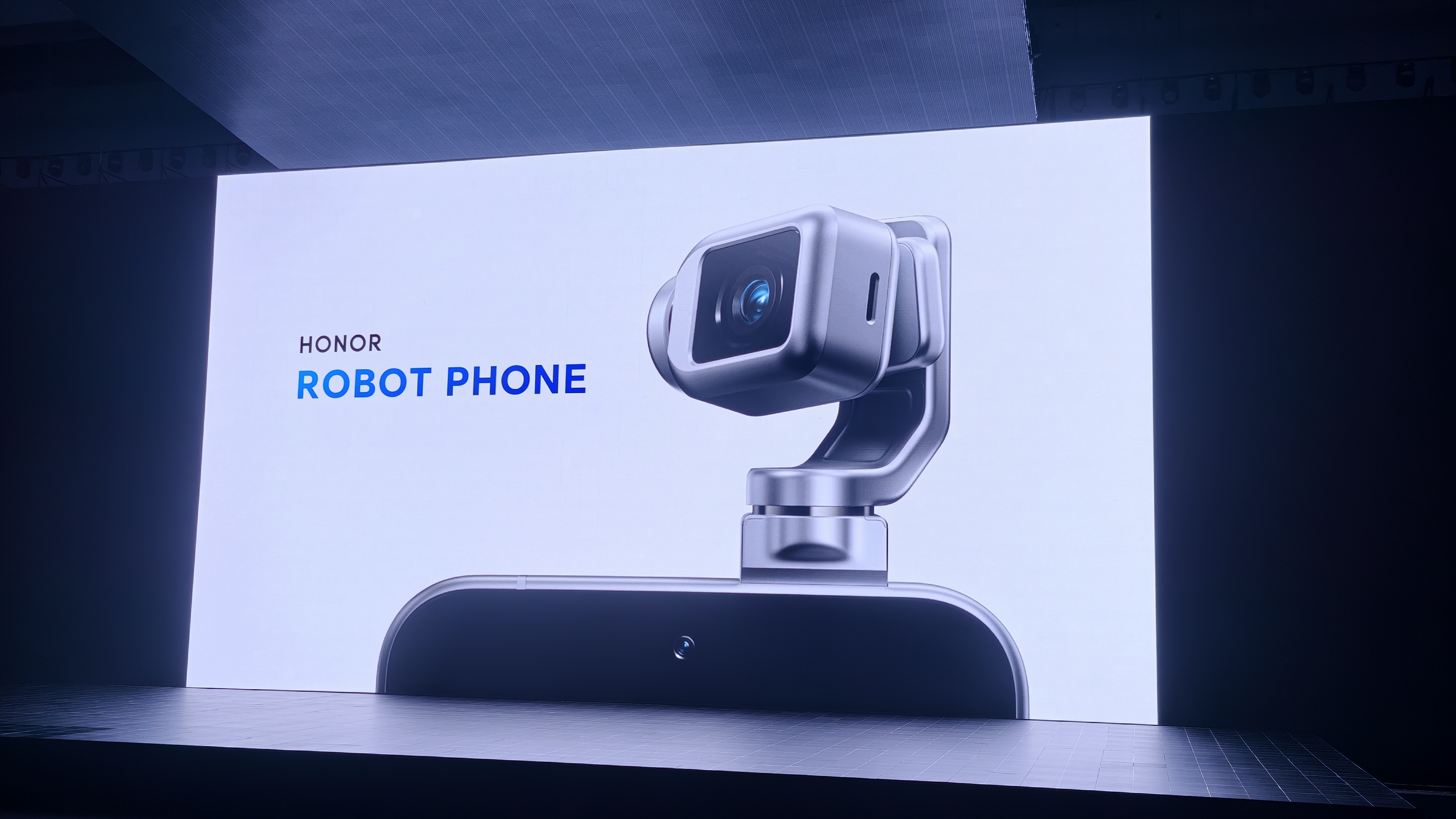 令人惊喜的是,今天荣耀还发布了一款“One More Thing”——荣耀Robot Phone,一部搭载了可翻转摄像头、颇有些“机器人”感的AI手机。
