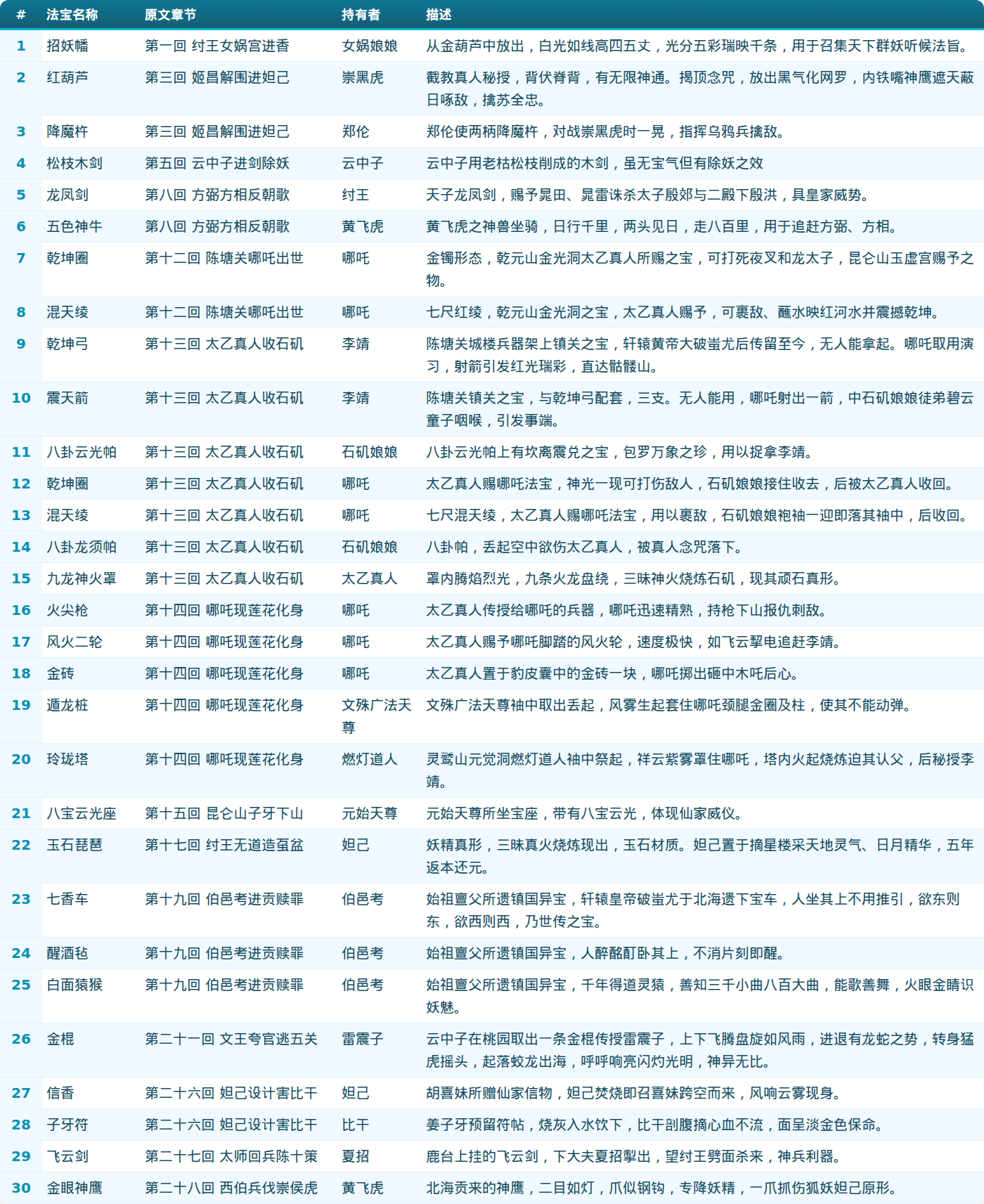 数据说明:本文整理自《封神演义》原著,按章节顺序记录,力求准确完整。部分法宝多次出现的,记录了关键出场信息。如有遗漏或错误,欢迎大家指正!