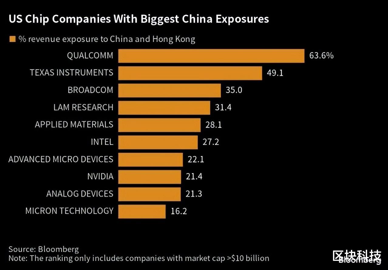 根据公布的财报显示,高通的收入中有63.6%来自中国市场,德州仪器的收入中有49.1%来自中国市场,博通的收入中有35%来自中国市场。对于其他如泛林集团(31.4%),应有材料(28.1%),英特尔(27.2%),AMD(22.1%),英伟达(21.4%)在内的企业来说,中国市场也不可或缺。