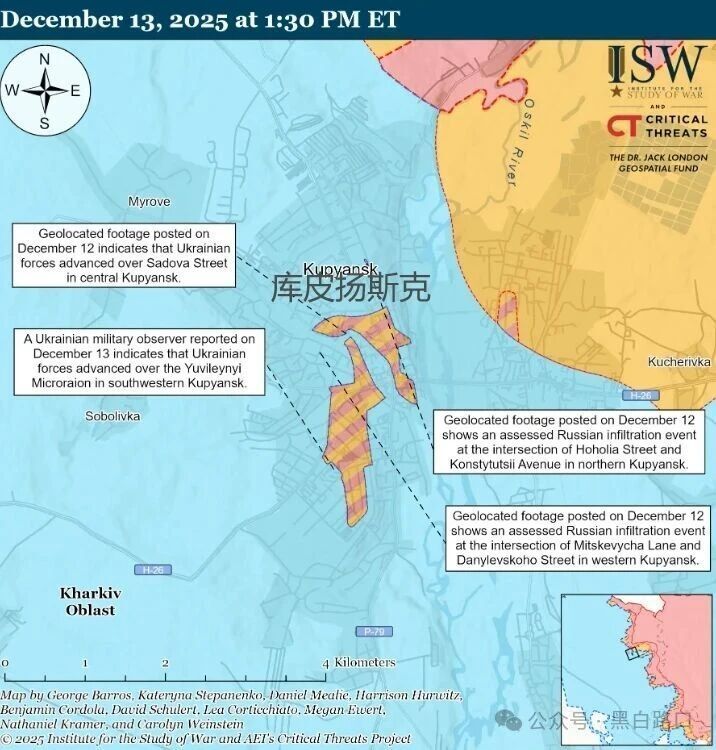 库皮扬斯克方向,乌军继续在库皮扬斯克及其周边地区推进,战争研究所(ISW)披露乌军自2025年9月起开始反攻行动,通过近3个月的反击,乌军成功收复库皮扬斯克,击溃进攻的俄军,反击仍在进行中。