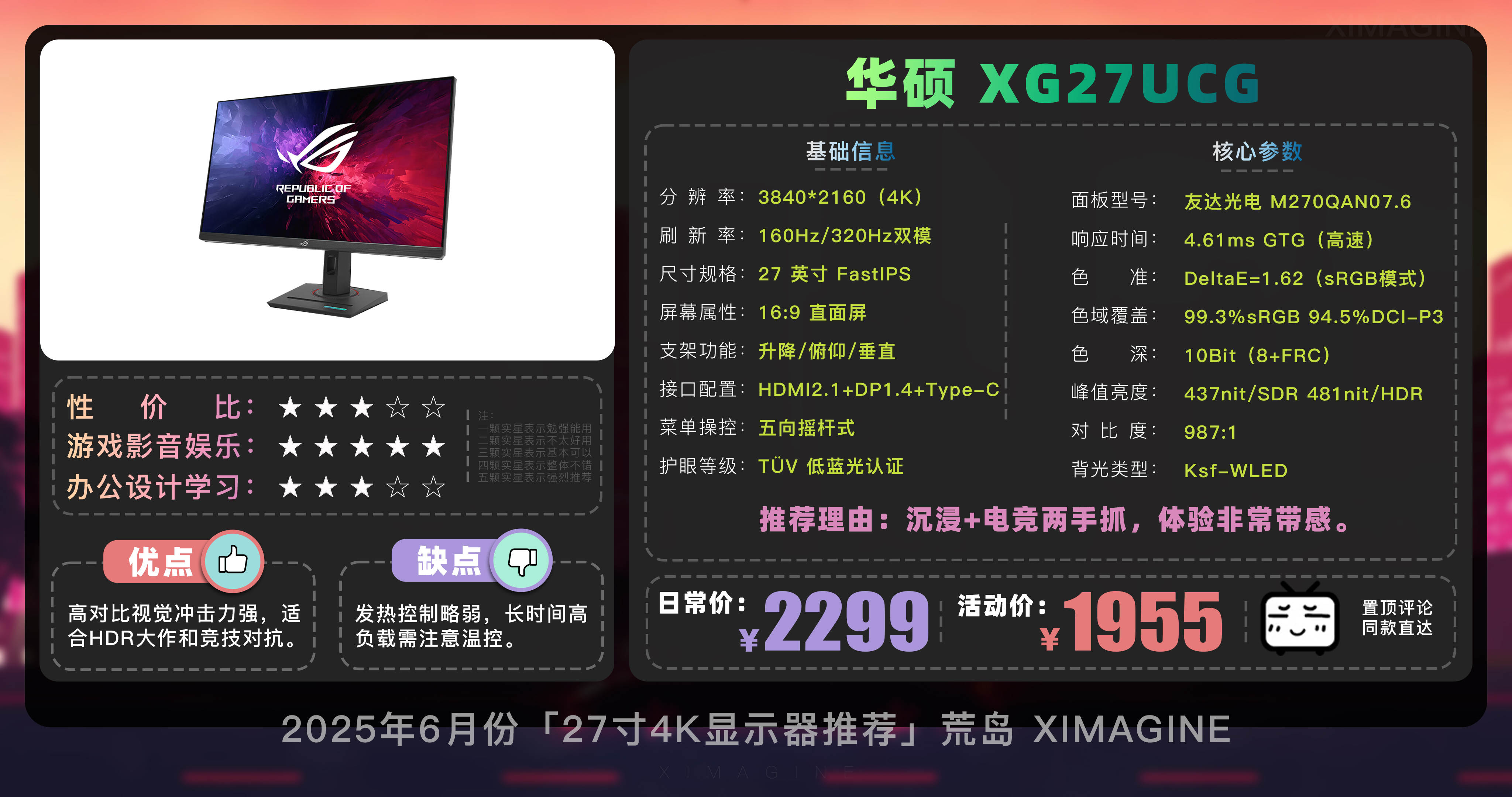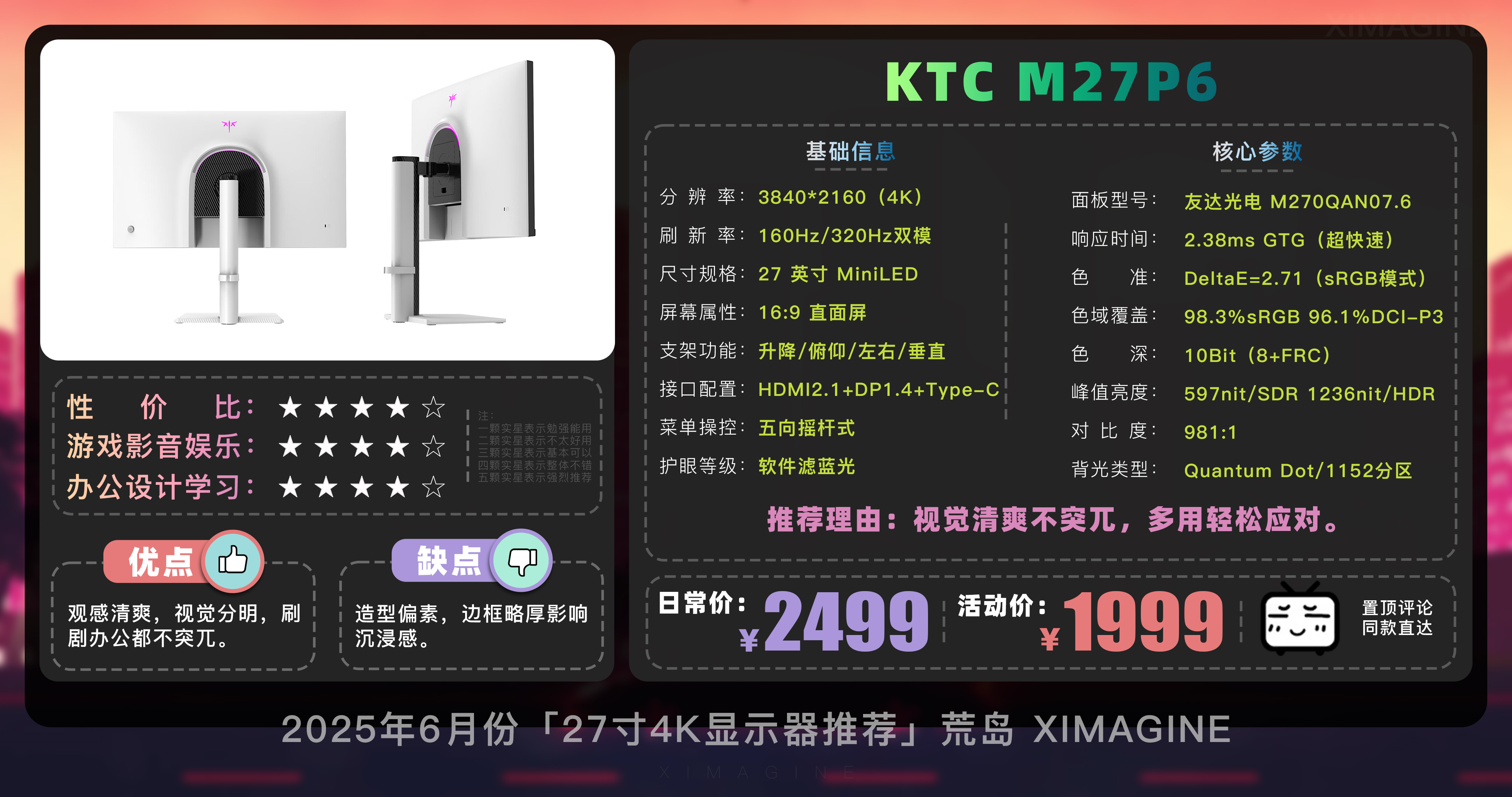 以上就是本期2025年6月27寸4K显示器推荐,27寸4K显示器从入门款到准旗舰,不同价位都有能打的选手,关键是得选对场景、用对方法,显示器没必要盲目追配置,真正适合自己的那一台,才值票价。本期就到这,如果视频中有你心水的型号,请戳评论区置顶链接直达,如果觉得内容做的不错,请三连支持!我是「ximagine」下期再会!